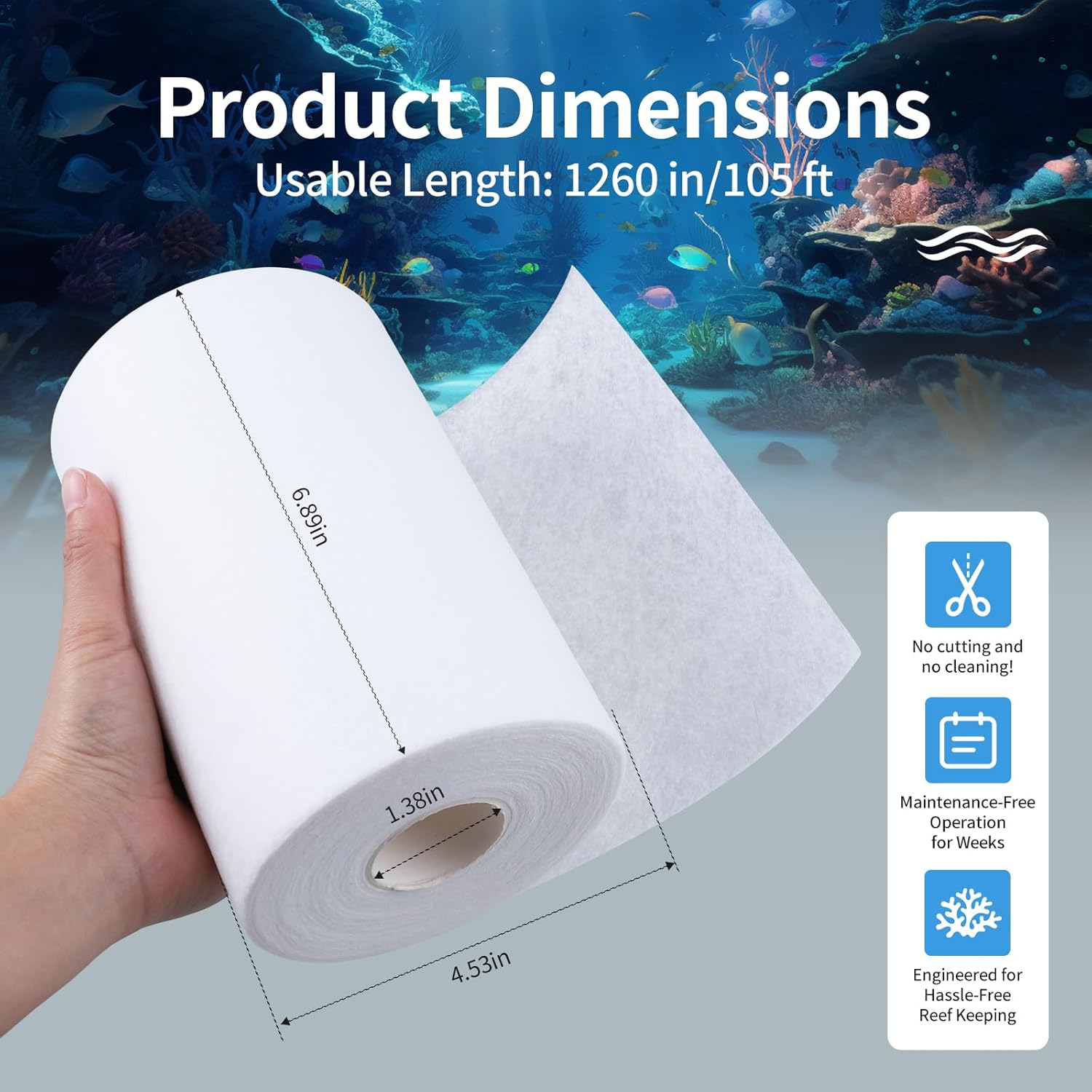 Measuring 104 feet x 6.85 inches, this replacement filter fleece roll is tailor-made to fit the 1200 filtration system seamlessly. No modifications required—enjoy a hassle-free replacement process that saves you time and ensures a snug. High-Efficiency Filtration for Crystal-Clear Water Crafted from premium non-woven polyester, this filter media pad boasts exceptional debris-trapping capabilities. It effectively captures fine particles, impurities, and organic waste, preventing cloudiness and maintaining optimal water quality for coral tanks and marine aquariums. The high-flow design promotes maximum water circulation while resisting clogs, ensuring your filtration system operates at peak efficiency. Durable & Tear-Resistant Construction Made from high-density non-woven polyester fleece, this filter roll offers outstanding durability and tear resistance. Built for long-lasting use, it provides reliable filtration even in high-demand environments, reducing the frequency of replacements and delivering consistent value for your investment. Automated Advancement for Hassle-Free Maintenance Equipped with an integrated automated advancement system, this filter roll minimizes manual intervention. It automatically advances fresh fleece as needed, extending replacement intervals and ensuring uninterrupted filtration performance. Spend less time on tank upkeep and more time enjoying your aquatic hobby. Tool-Free & Quick Installation Install or replace this filter roll in just 5 minutes—no tools required. It’s ready to use right out of the box and connects directly to compatible systems, making it ideal for both beginner and experienced aquarium keepers. Please confirm your filtration system model before purchase to ensure compatibility. For optimal results, follow the recommended replacement schedule based on your tank size and bioload.