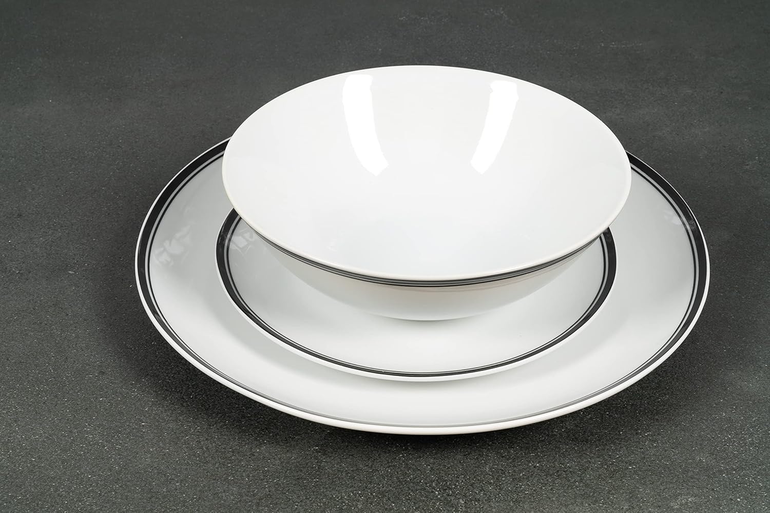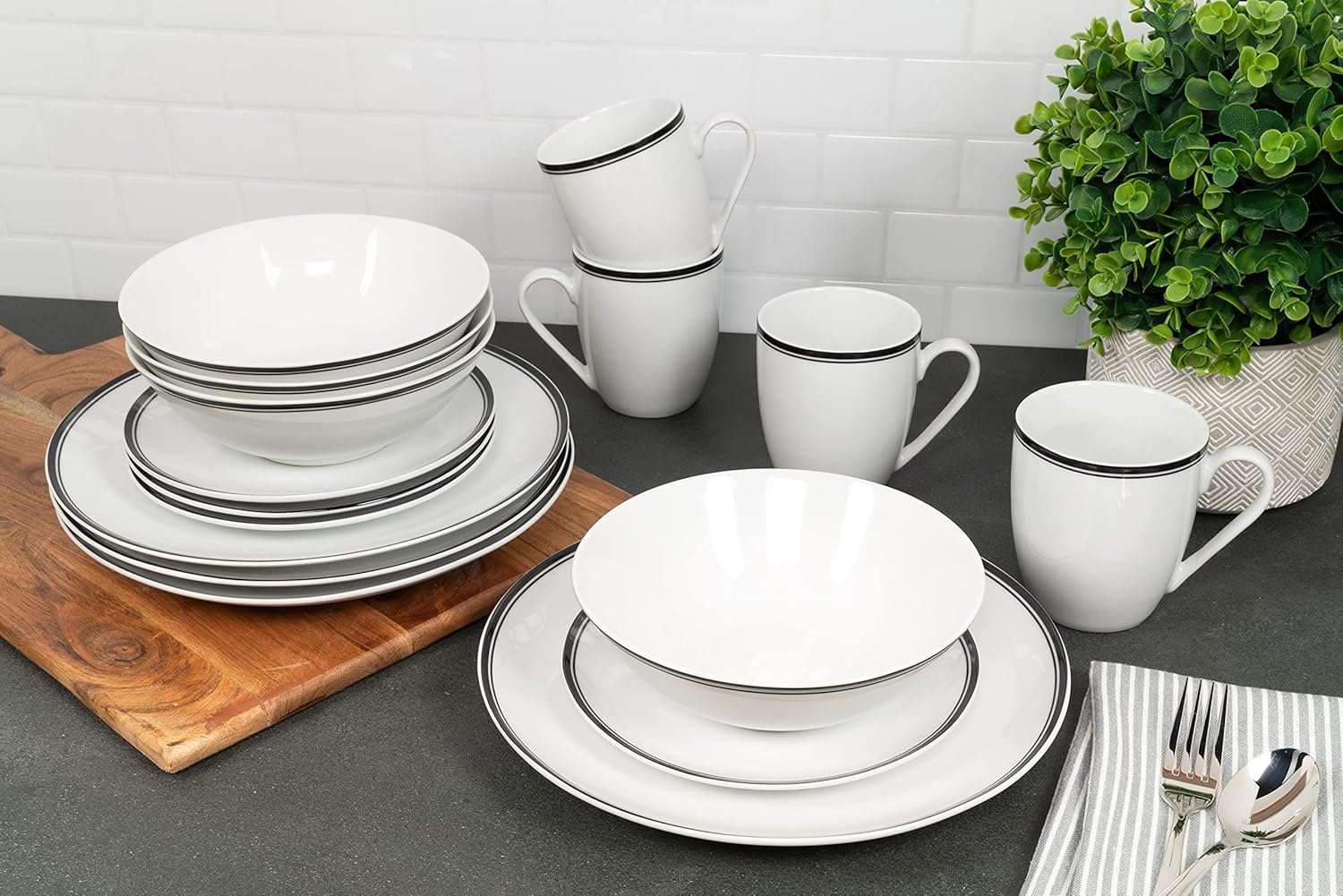 Classic, clean, and durable, the Cafe Stripe collection sports a seamless shape and a double banded rim decal in a variety of stylish shades. Made with oven-to-table, microwave, and dishwasher safe ceramic these dishes will be your go-to for breakfast, lunch, dinner, and snacks in between. Service for four this set includes: 4 dinner plates, 4 salad plates, 4 soup bowls and 4 mugs.