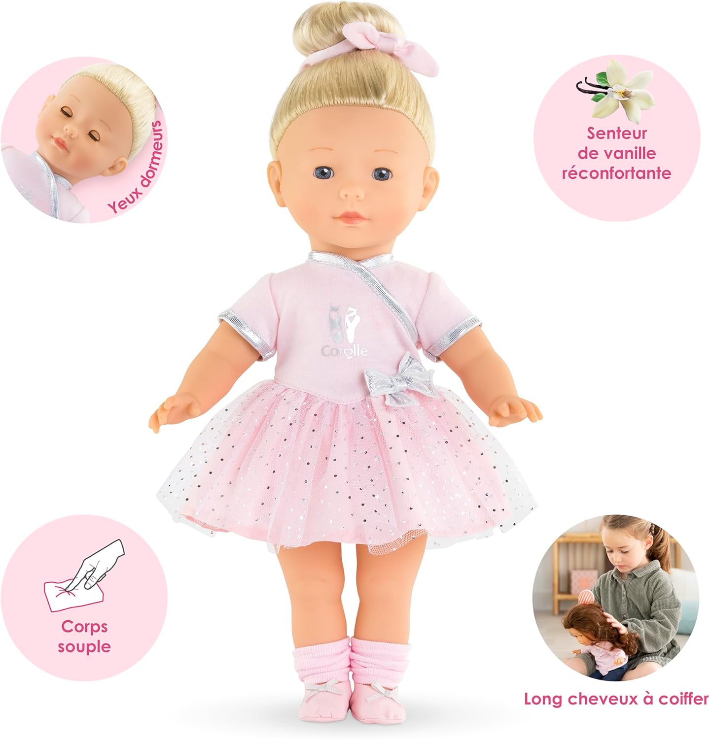 Constance Ballerina is ready to go to her dance class with her girlfriends! Constance Ballerina, doll of 36 cm, has a soft body "effect" underwear and long smooth blond hair easy to comb. LIGHT SKINED DOLL - Its face, arms and legs, with delicate vanilla scent, are made of soft touch vinyl. She closes her blue eyes when she is laid on her back. She is dressed in a trendy all-in-one dance outfit with a wrap and a long pink tulle petticoat. To perfect her outfit, she wears dance slippers with matching gaiters and she is styled with a beautiful bun using a pink scrunchy! Constance Ballerina has more than 100 references of clothing and accessories to personalize her look as desired and imagine many stories inspired by everyday life. My Corolle : My doll, my stories! Suitable for ages 3 and above.