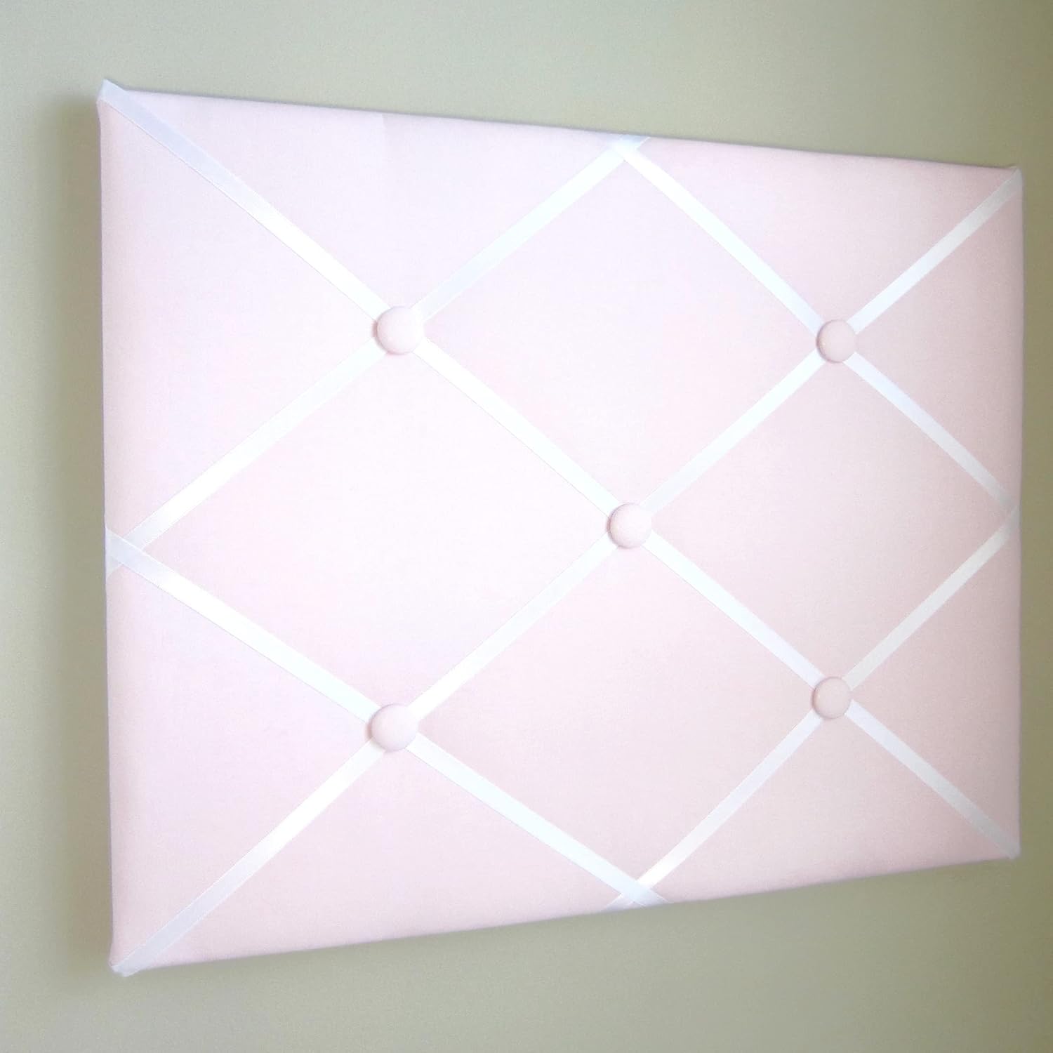 This 16"x20" memory board will have a light pink fabric background. You choose the ribbon colors. The buttons will be covered in light pink fabric. The ribbon on this memory board will be satin. Handmade fabric memory boards are designed to be used without tacks or push pins. This memory board is made with designer fabrics and top quality materials. The back is finished with a felt back and ribbon. Each memory board has a saw tooth hanger on the vertical and horizontal sides. Because each memory board is made to order fabric placement may vary.