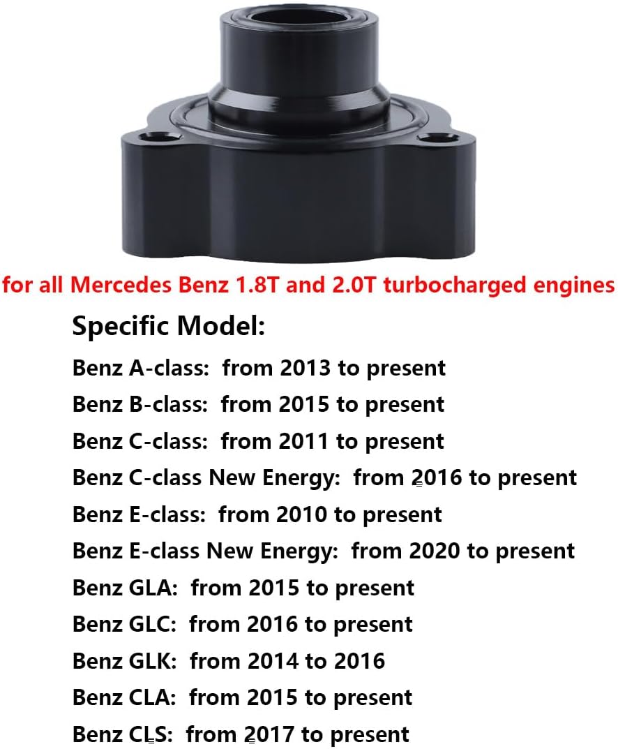 Compatible With all Mercedes Benz 1.8T and 2.0T turbocharged engines Specific Model: for Benz A-class: from 2013 to present for Benz B-class: from 2015 to present for Benz C-class: from 2011 to present for Benz C-class New Energy: from 2016 to present for Benz E-class: from 2010 to present for Benz E-class New Energy: from 2020 to present for Benz GLA: from 2015 to present for Benz GLC: from 2016 to present for Benz GLK: from 2014 to 2016 for Benz CLA: from 2015 to present for Benz CLS: from 2017 to present
