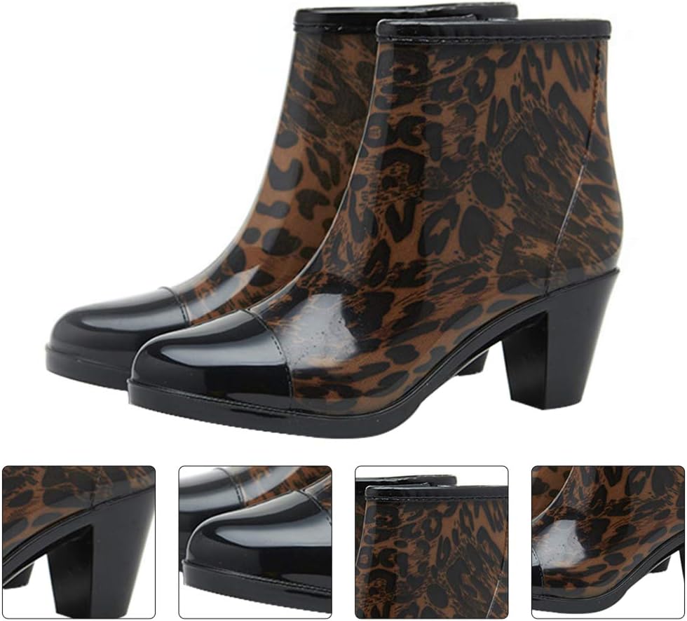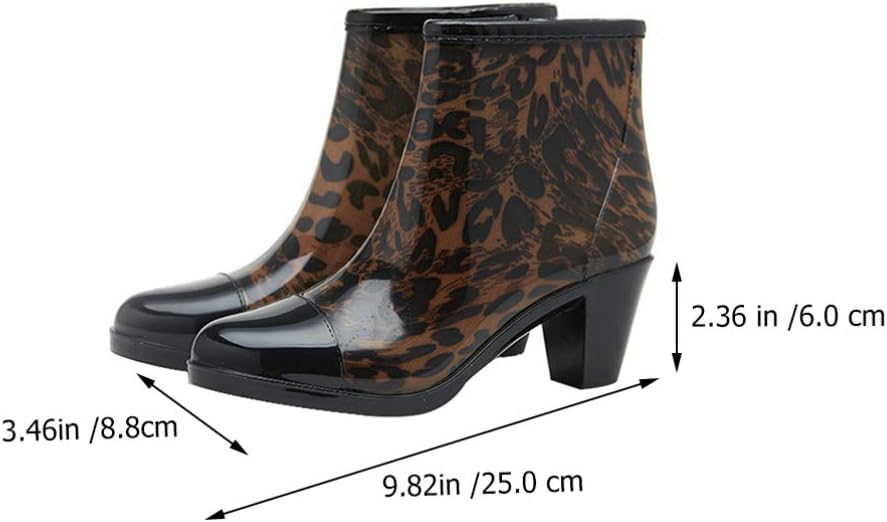 DescriptionThis is female high heel rain boots, made of , they are durable and soft, creative decorations design is beautiful, you will be happy. Non-skid sole, protect you from fall. They match with your clothes, pants or skirt .Features- Color: Leopard Black.-Material: PVC.-Size 36: 23.0CM, 6US, 3.5UK, 36.5EU, 9.039Inch; 23.00X8.00X6.00cm/9.04X3.14X2.36inch.-Size 37: 23.5CM, 6.5US, 4UK, 37.5EU, 9.2355Inch; 23.50X8.20X6.00cm/9.24X3.22X2.36inch.-Size 38: 24.0CM, 7US, 4.5UK, 38EU, 9.432Inch; 24.00X8.40X6.00cm/9.43X3.30X2.36inch.-Size 39: 24.5CM, 7.5US, 5UK, 38.5EU, 9.6285Inch; 24.50X8.60X6.00cm/9.63X3.38X2.36inch.-Size 40: 25.0CM, 8US, 5.5UK, 39EU, 9.825Inch; 25.00X8.80X6.00cm/9.82X3.46X2.36inch.Package Including1 pair Water Ankle Booties Winter Chunky Heels Boots Anti-Skid Zipper Boot Short Ankle Rain Boots Waterproof Booties