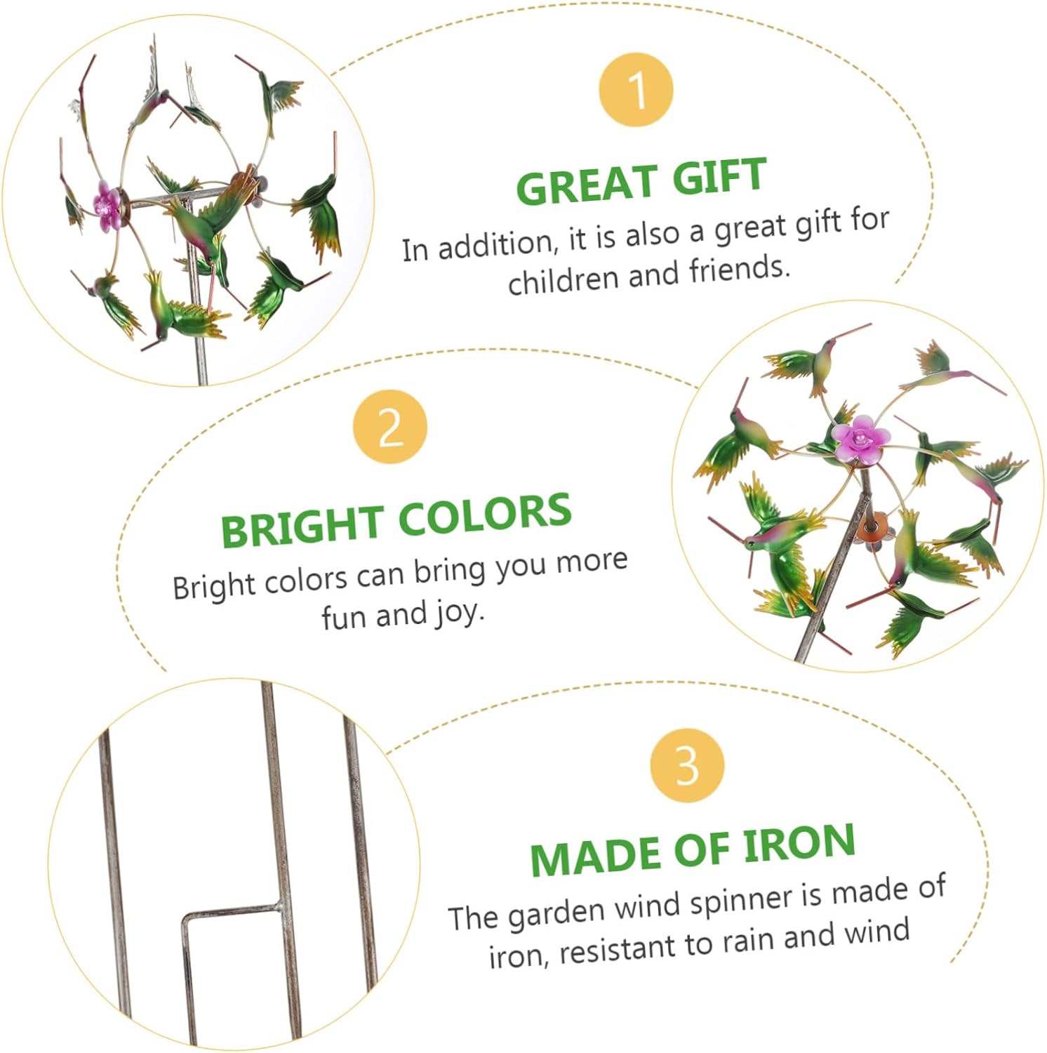 Package Include 1 x Set of Wind Characteristics -Size: 101.50X23.00X15.50cm/39.89X9.04X6.09in swivel wind -Material: iron patio wind spinner - Relaxing to watch while spending time in your porch or yard wind stake. - Add a touch of ambiance to your patio, yard, lawn or windmill. - Our wind has a solid metallic construction with easy design wind decoration. - Easily seen and admired by passers-by but not intrusive to neighbors metal wind. - Would look amazing in any flower garden or backyard, an present for garden lovers lawn wind spinner.Goods Descriptionswivel wind Our yard wind has a stability stake at the base to ensure its firmly planted for windy days.wind decoration Large size with eye-catching design, attract your attention even at a distance.wind stake Can be used as an ornament for garden lawn, outdoor party, etc.patio wind spinner It also can help you to find the wind direction