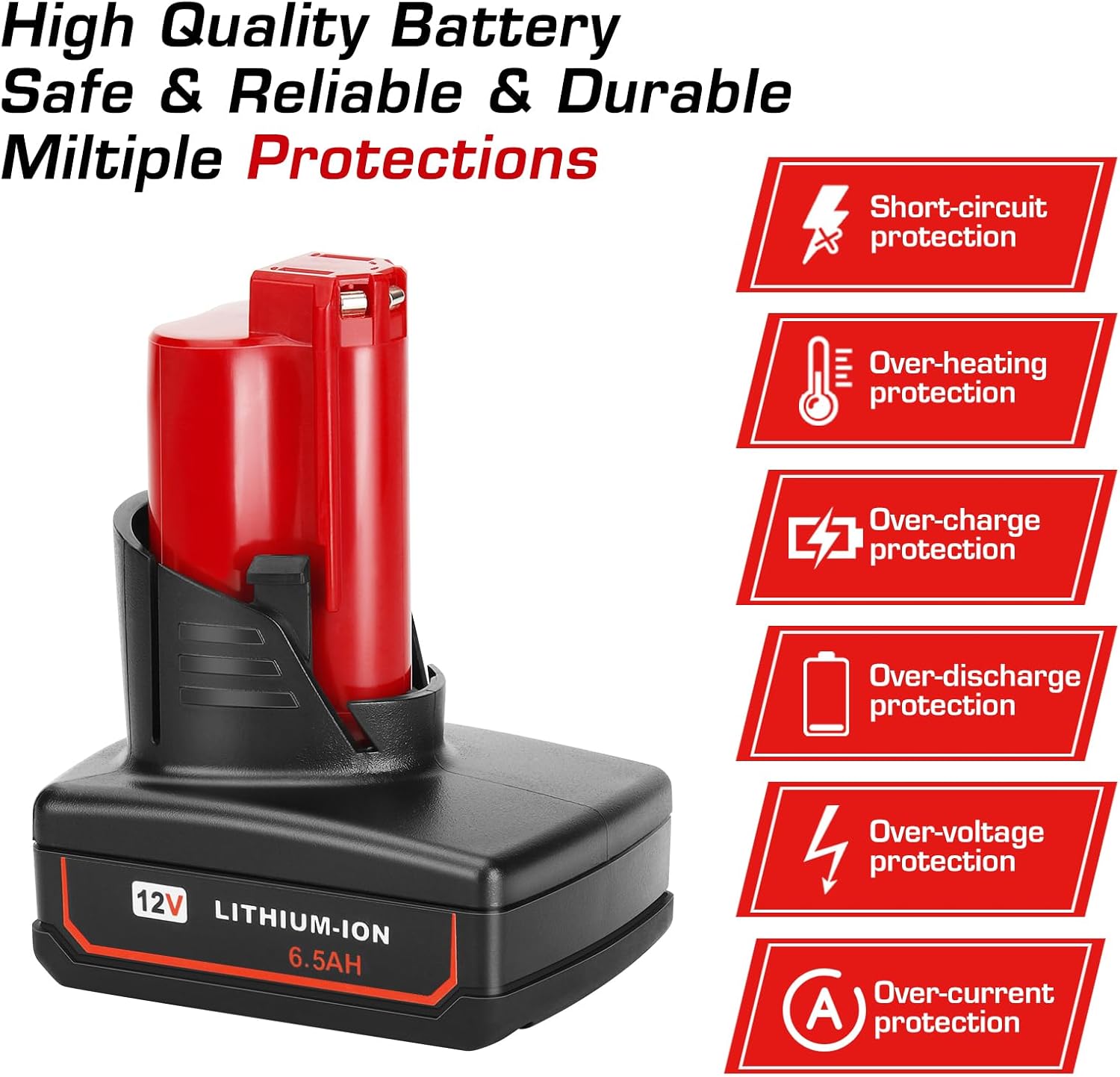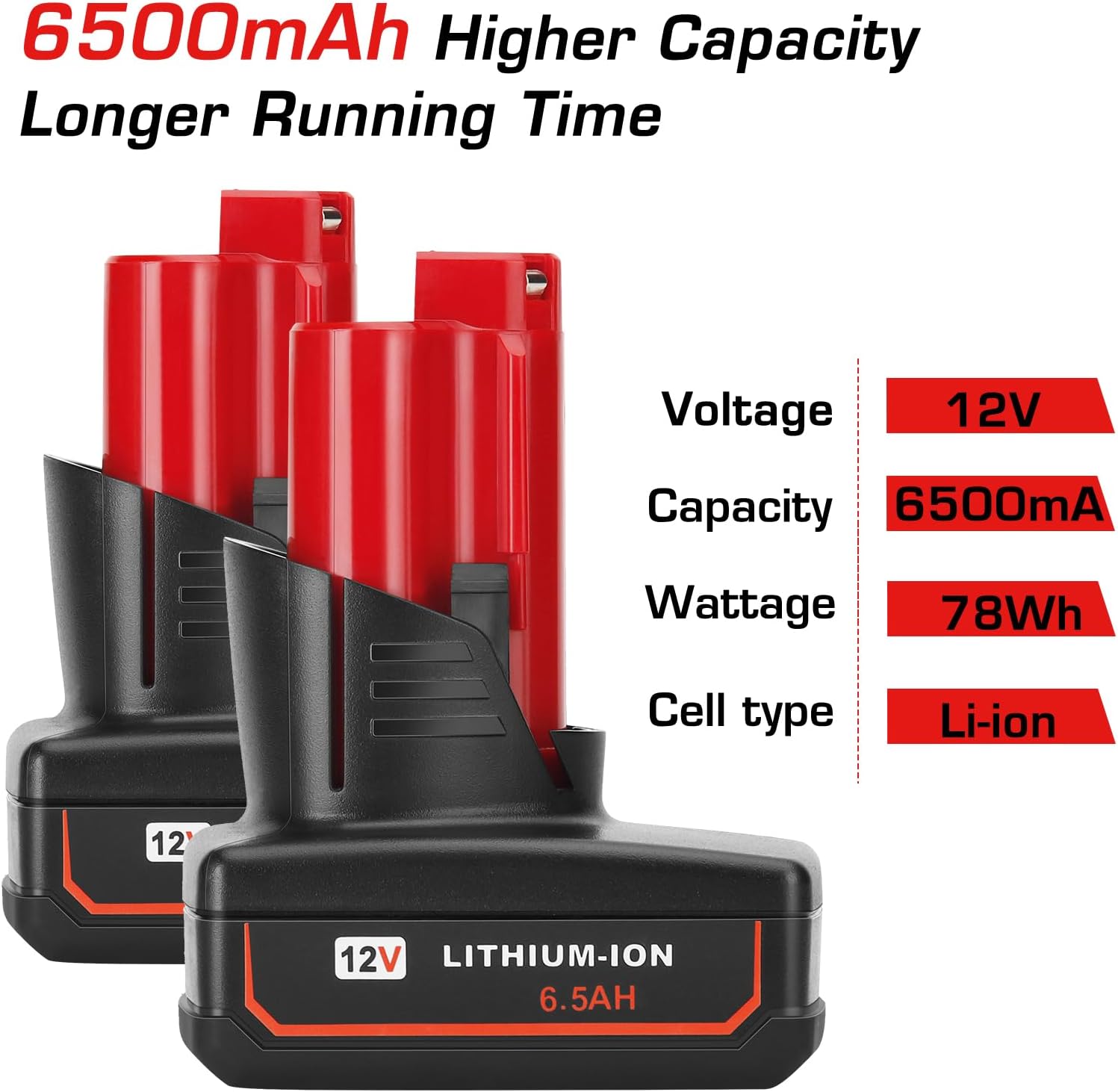 2 Pack 6.5Ah 12V Lithium-ion Battery Replacement for Milwaukee 12 Volt Battery, Compatible with Milwaukee 12V Cordless Power Tools.Specifications:Voltage: 12VCapacity: 6500mAhWattage: 78WhCell: Li-ionReusability: RechargeableCompatibility: Replace for Milwaukee 12v batteryQuantity: 2 PacksFeatures:- Higher capacity of 6500mAh, provides longer working time.- Very easy to install and remove the battery from your tools.- Made of Li-ion cell, no memory effect, stable and reliable for use.- Protected by strong and durable shell made of sturdy PC+ABS material, durable for use.- With the indicator light, you can check the remaining battery power.- Safe for use, made of battery protection chip provides over-charging, over-discharge, over-voltage, over-heating, and short-circuit protections.Replacement for Milwaukee M12 battery part number: 48-11-2401, 48-11-2402, 48-11-2411, 48-11-2412, 48-11-2420, 48-11-2425, 48-11-2430, 48-11-2440, 48-11-2450, 48-11-2460, etc.Compatible with Milwaukee M12 cordless power tools:2207-20, 2238-20, 2239-20, 2276-21, 2277-20, 2290-20, 2310-21, 2311-20, 2401-20, 2401-22, 2402-20, 2550-20, 2551-20, 2551-22, 2552-20, 2553-20, 204-20, 204-21, 205-21, 303-20, 303-21, 304-20, 305-20, 305-21, etc. Compatible with Milwaukee M12 battery chargers:48-59-2401, 48-59-1204, 49-24-2310, 48-59-1201 and compatible with Milwaukee M12 & M18 multi-voltage battery chargers 48-59-1808, 48-59-1810, 48-59-1812, 48-59-1807.