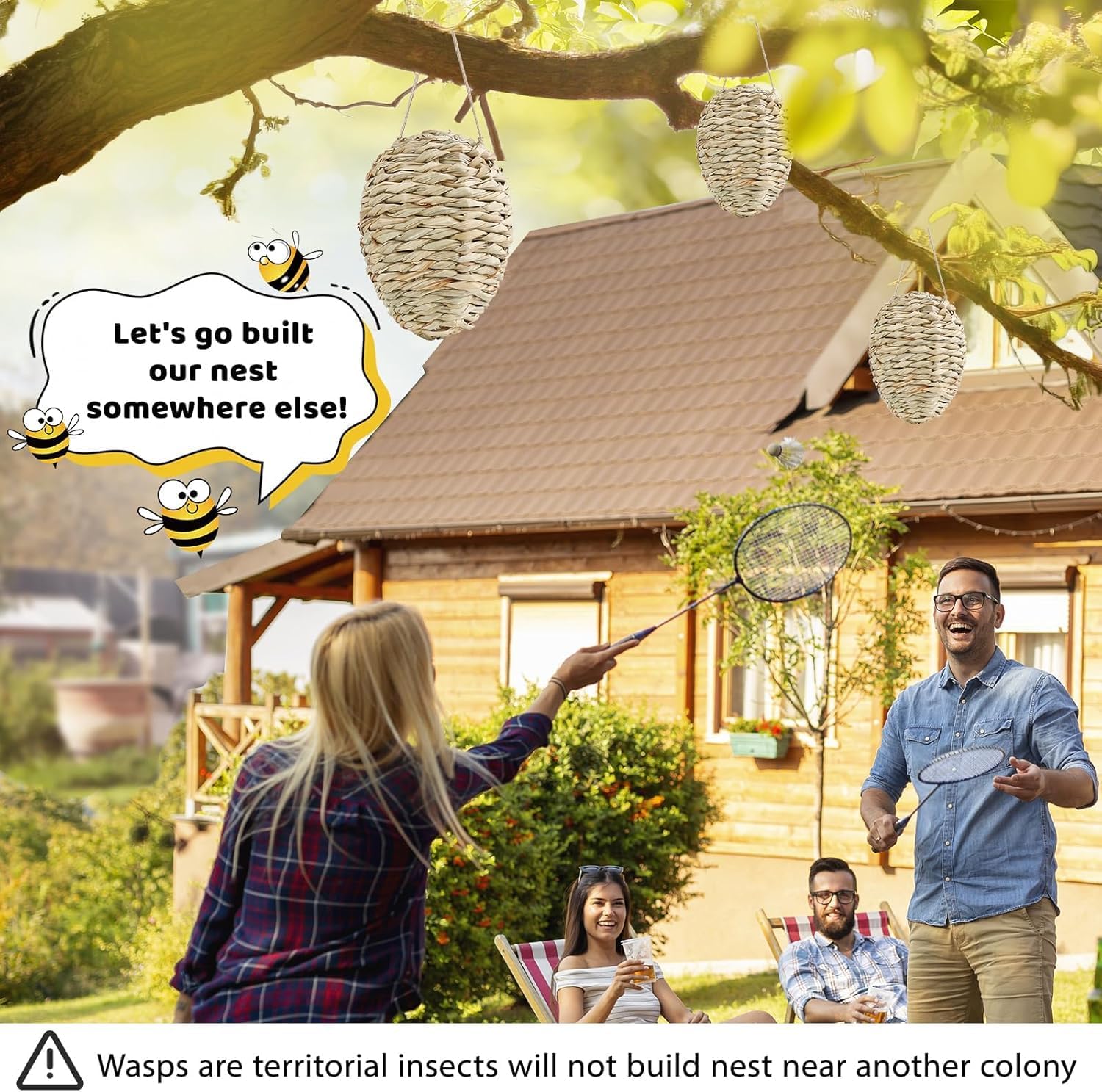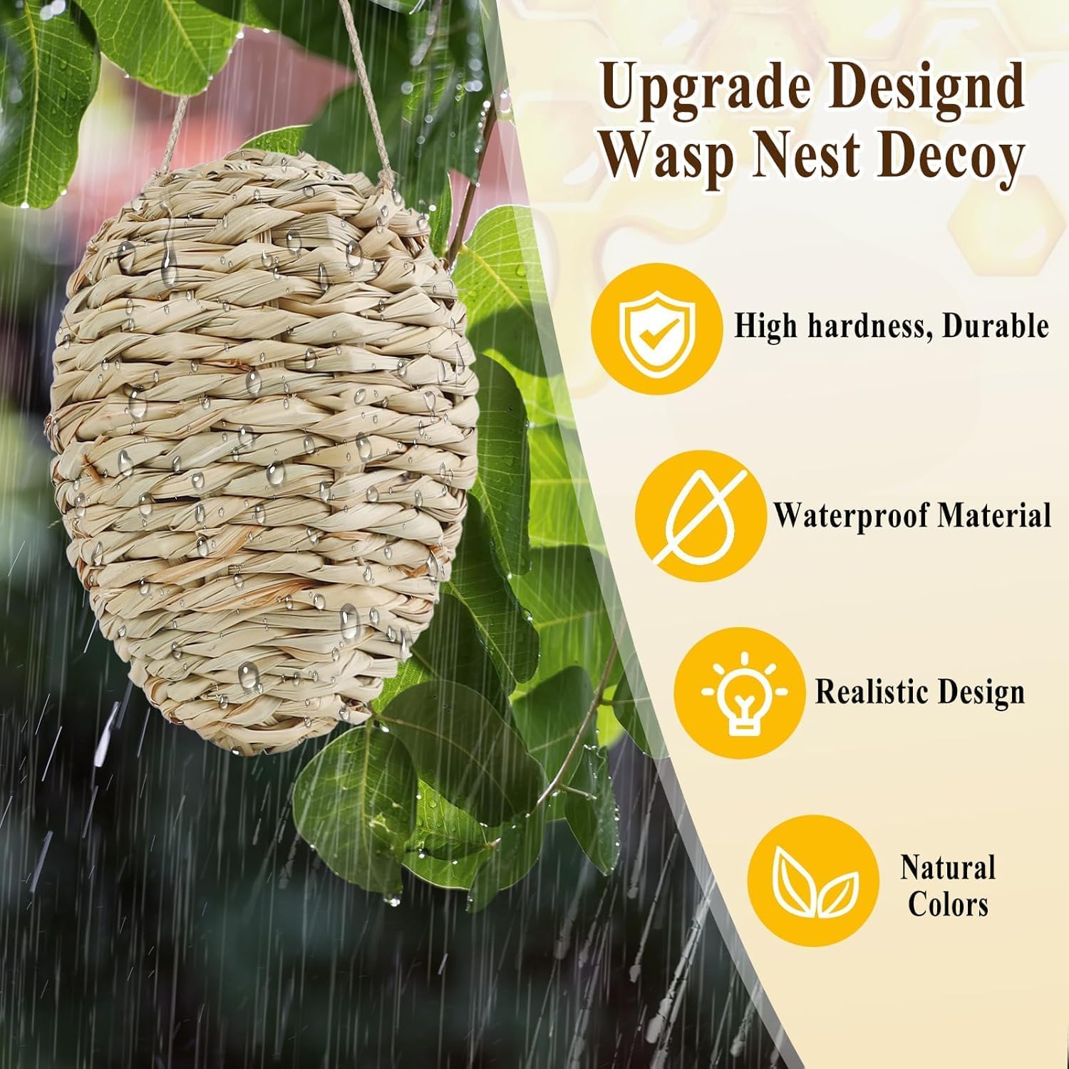 Transform your outdoor spaces into serene sanctuaries with our Natural Reed Fake Wasp Nests A harmonious blend of practical protection and rustic charm. Crafted from sustainably sourced, rigid reed and adorned with high-strength hemp ropes, these wasp hornet nest decoy not only deter wasps effectively but also elevate your garden, patio, or campsite with their lifelike texture and earthy tones. Why Choose Us? Smart Defense: Leverage wasps’ territorial instincts—no chemicals, no hassle. Just hang and let nature do the rest. Built to Last: Tightly woven reed and reinforced ropes withstand rain, wind, and sun, ensuring years of reliable use. Effortless Style: Ready to hang with pre-attached ropes; their authentic appearance blends seamlessly into gardens, pergolas, or picnic nooks.