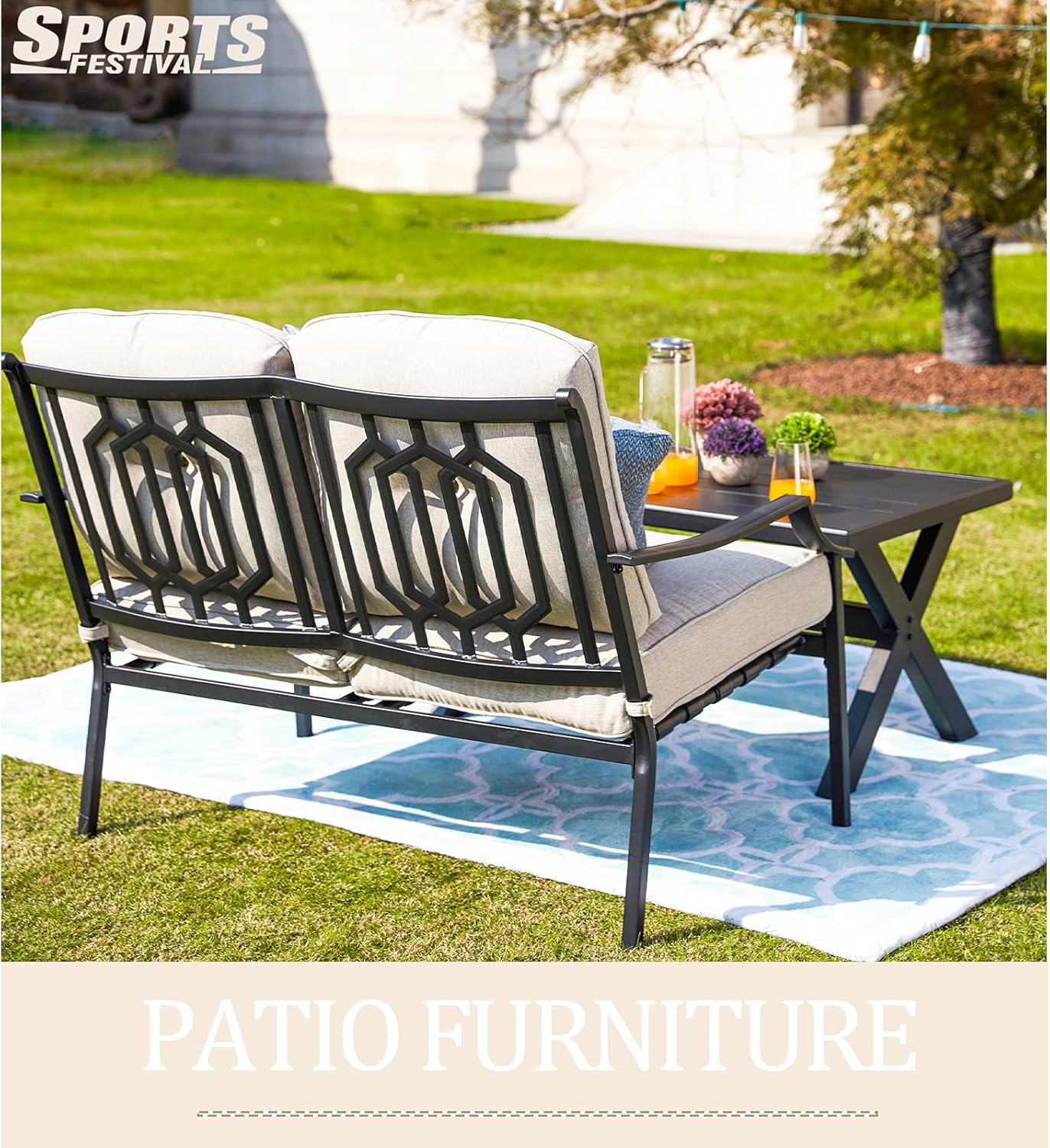 Sports Festival 2-piece patio conversation set is designed for long-term outside use. Perfect for sitting at your backyard, enjoying the scenery. Crafted with a metal frame in powder-coated black finish, the furniture set is durable and easy to maintain. Sports Festival is committed to enhance human being's living level. We are creating a practical and luxury furniture brand. What we've been doing is selecting premium materials to produce quality products, following the concept of environment protection.FeaturesšEasy assembly with included hardware and accessoriesšThick and comfortable foam filled cushionsšPowder-coated steel structurešOlefin fabric of cushion coveršErgonomic angled armrestšWide and deep seatDimensionsLoveseat : 47.6"(D) x 30.3"(W) x 35"(H)Table: 39.8"(L) x 23.8"(W) x 19.7"(H)Seat cushion thickness: 5.9"Back cushion thickness: 5.1"Seat: 23"(D) x 44.3"(W) x 13"(H)DetailsAssembly Required: YesStyle: ModernCommercial / Residential: ResidentialCushion Color: BeigeCushion Style: Box EdgeCushion Features: UV ResistantFabric Type: Polyester-Olefin BlendFill Material: FoamFrame Finish: BlackFrame Material: SteelSet Included: 1 loveseat, with seat and back cushions, 1 rectangle coffee tableLoveseat Weight Capacity: 500 LBTable Weight Capacity: 110 LBNotice1. Assemble: Hardware and accessories are included. Please assemble according to instructions.2. There may be some color difference caused by display of the monitor and the light.3. Maintenance: Wipe frame with no color damp cloth when necessary.