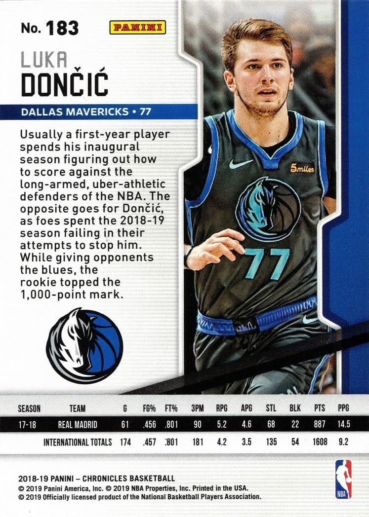 2018-19 Panini Chronicles Playoff Basketball #183 Luka Doncic Rookie Card - Dallas Mavericks. This is an original, authentic Luka Doncic basketball card produced by Panini in 2019. In the upper left corner region of the card you will see the official RC logo, indicating that this is a true Rookie Card. Card is in Near Mint condition. Stock photo shown.