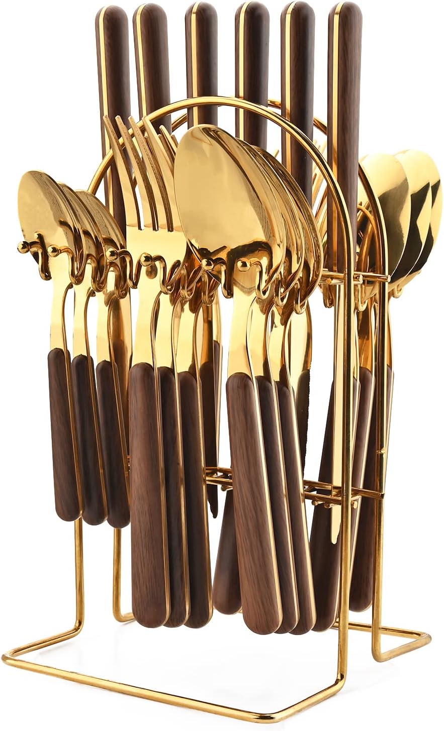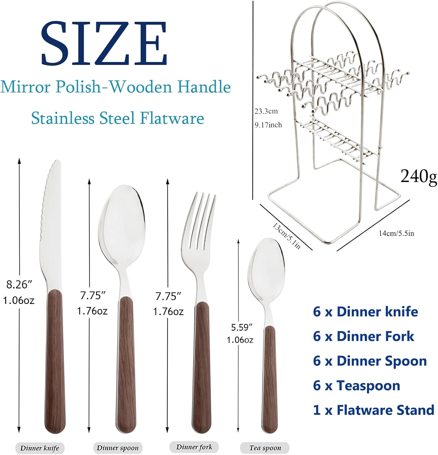 Color:Silver Why Choose Us? :) - Made of 18/0 Stainless Steel. * Dishwasher safe, easily clean up. * Make your kitchen and dining table elegant. * Specially designed round wooden handles make your dining table look more retro and sophisticated * Best Gift for Wedding Birthday Festival Housewarming product size Knife Dimensions: Length: 8.26 inch Weight: 30g Dinner Spoon Dimensions: Length: 7.75 inch Weight: 50g Tea Spoon Dimensions: Length: 5.59inch Weight: 30g Dinner Fork Dimensions: Length: 7.75inch Weight: 50g Cutlery Rack Length: 5.12*5.71*9.17 inch Weight: 240g Happy shopping!