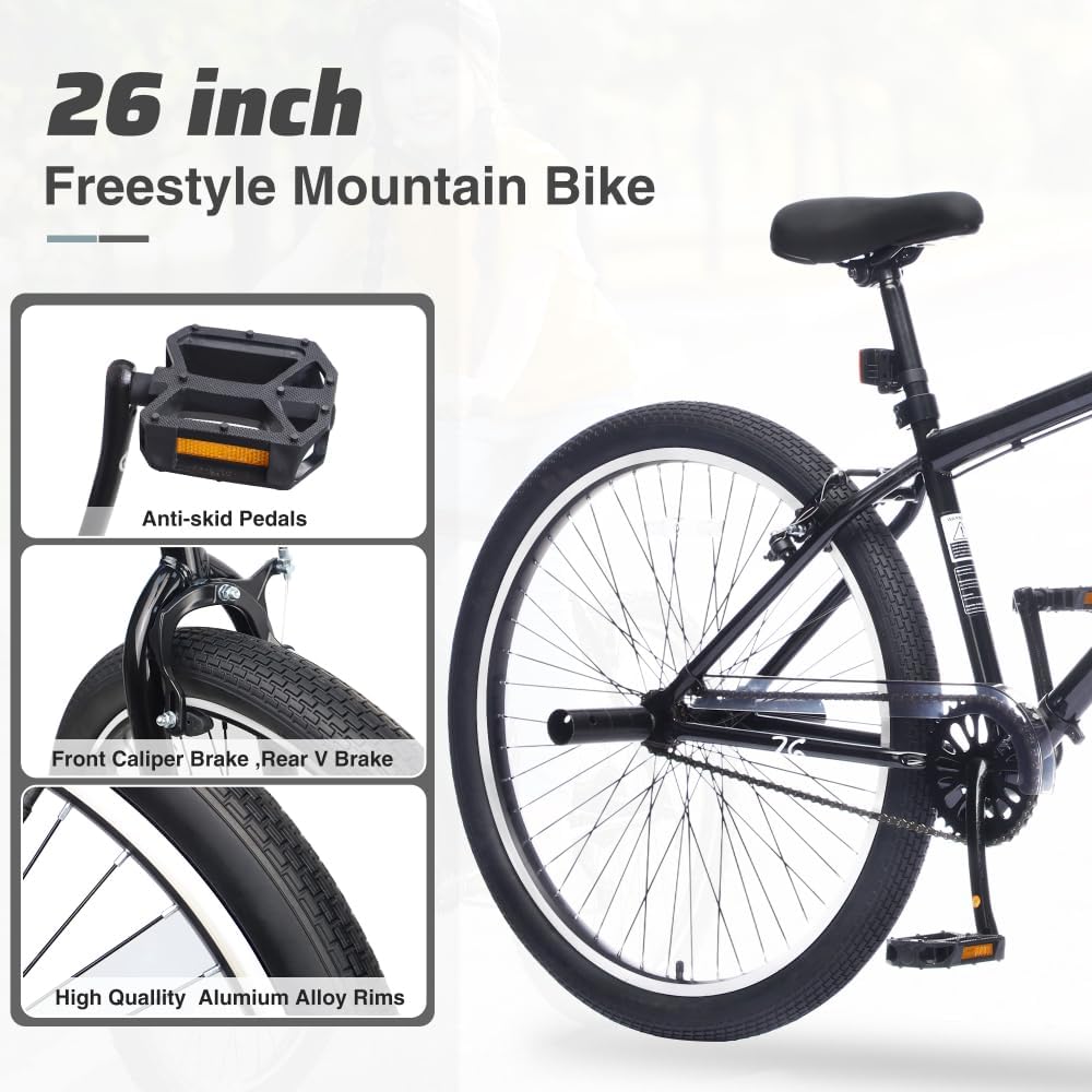 26 Inch Freestyle MTB – Ideal for Teens & Young Adults Ages 14+ Designed for hassle-free fun and reliable performance, this single-speed freestyle mountain bike is tailored for teens and young adults who crave casual rides, street adventures, or backyard freestyle fun. No fancy gear shifts, no complicated setup—just pure cycling enjoyment! Effortless Single-Speed Riding Ditch the hassle of complex gear adjustments with a smooth single-speed system, perfectly suited for teens and young adults. Focus on the thrill of cycling, mastering small tricks, or cruising through your neighborhood without distractions. It’s built for fun, not fuss! Durable & Stable Build for All Scenarios Crafted with a high-quality carbon steel frame, this bike delivers superior sturdiness and stability to handle daily rides and light freestyle maneuvers. Paired with lightweight aluminum alloy rims and high-performance 26×2.35 clincher tires, it ensures a smooth, comfortable ride whether you’re exploring light trails, cruising streets, or enjoying backyard adventures. 85% Pre-Assembled for Quick Setup (No Extra Purchases Needed!) Skip the tedious trips to the bike shop! This bike arrives 85% pre-assembled, complete with free installation tools and pedals—no additional purchases required. Even if you’re a total beginner at bike assembly, you can put it together in minutes and hit the road right away. Dual Brake System for Maximum Safety & Confidence Ride with peace of mind thanks to the reliable front caliper brake and rear V-brake combination. This dual brake system delivers fast, responsive stopping power, giving you full control whether you’re navigating busy streets, light off-road trails, or slowing down after a fun ride. Safety first, fun always! Single Box Delivery – Perfect for Gifting or Personal Use Shipped in one compact package, this bike ensures hassle-free receiving and easy storage when not in use. No messy multiple boxes to unpack or organize—making it an ideal gift for teens who love cycling, or a great pick for your own casual riding needs. Product Specifications Table Specification: Details Bike Type: Freestyle Mountain Bike (MTB) Age Range: Teens & Young Adults (14+) Recommended Rider Height: 5'4" – 6'2" (163cm – 188cm) Brake Style: Dual Brake System (Front Caliper Brake + Rear V-Brake) Frame Material: High-Quality Carbon Steel Rim Material: Aluminum Alloy Wheel Size: 26×2.35 Inches Frame Size: 15 Inches (Seat tube clamp to wheel center axis length) Maximum Load Capacity: 220 Lbs (100kg) Tire Type: High-Performance Clincher Tires (Outdoor-Ready) Speed: Single-Speed (1 Speed) Suspension Type: Rigid (Optimized for Freestyle, Casual Cycling & Light Outdoor Activities) Delivery Format: Single Box Product Application Scenarios: Garden, Outdoor, Street Riding, Casual Cycling Sport Type: Cycling