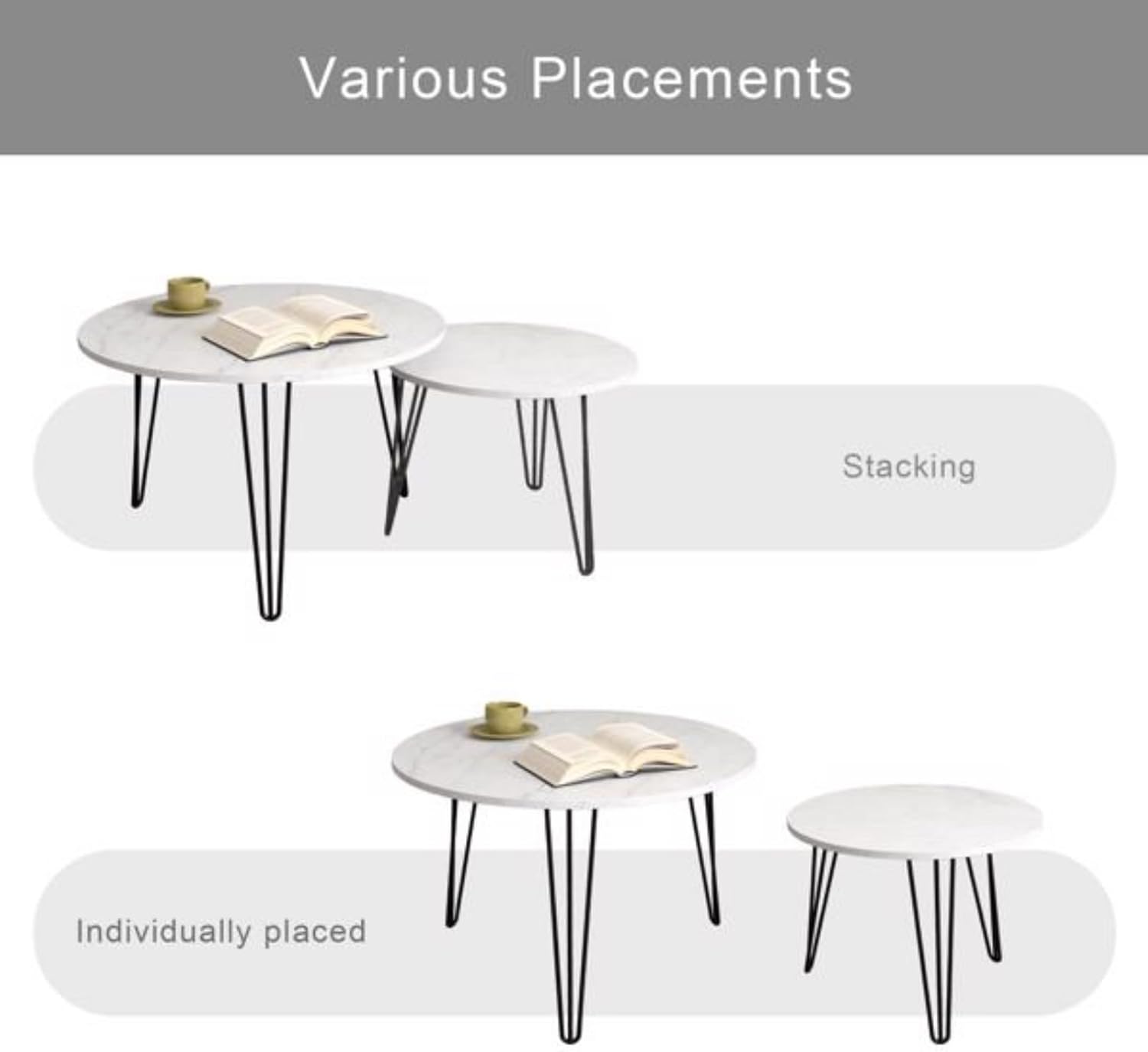 With a practical nesting design, you can pair these coffee tables together to create a visual flow, or use them individually to double up as a place to place drinks, plants, and other accessories. Perfect for living rooms, guest rooms, balconies, offices, apartments, and small spaces. Color: White Large Table Diameter (inches): 27.56 Large Table Height (inches): 17.71 Small Table Diameter (inches): 19.68 Small Table Height (inches): 14.96