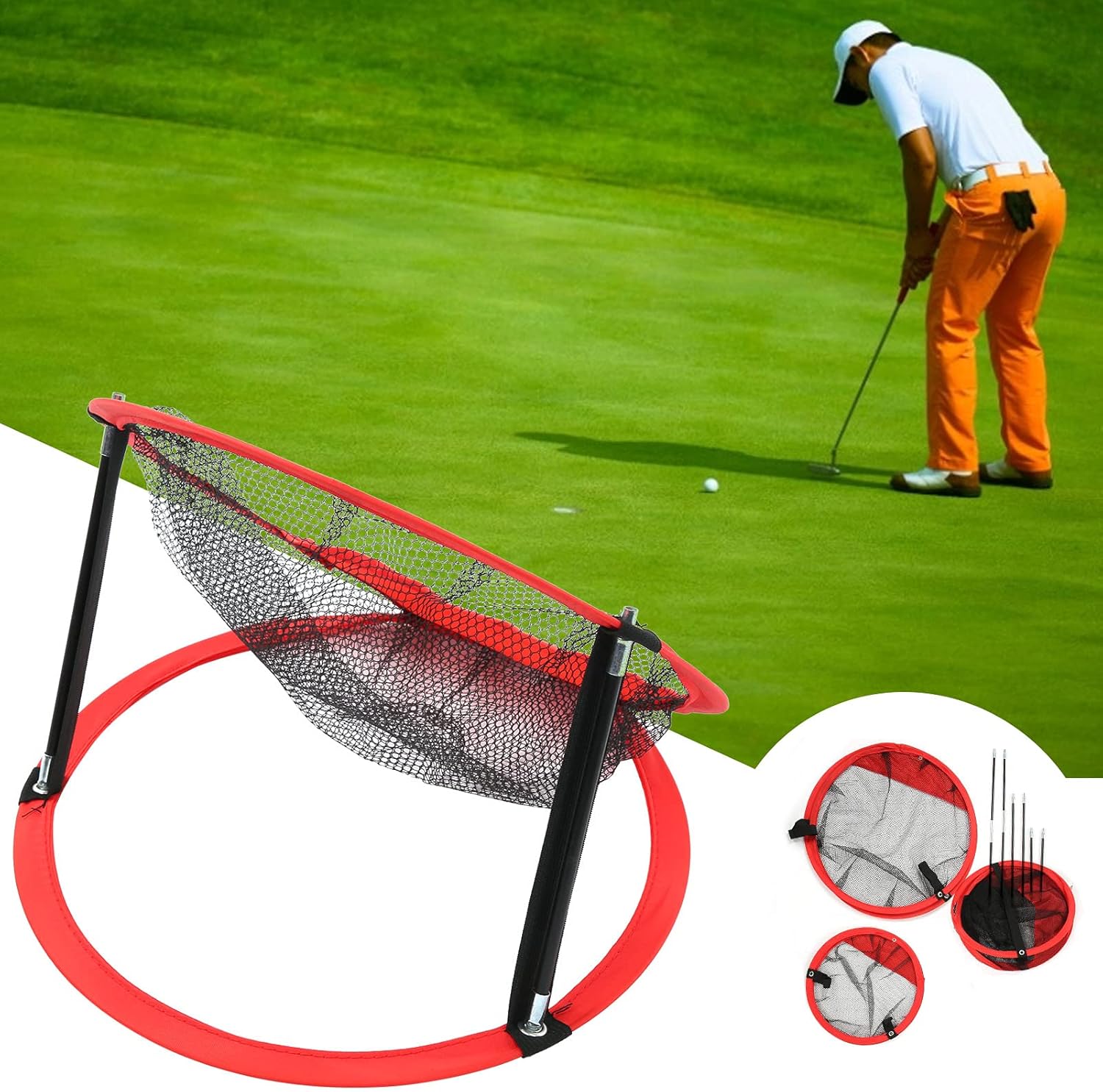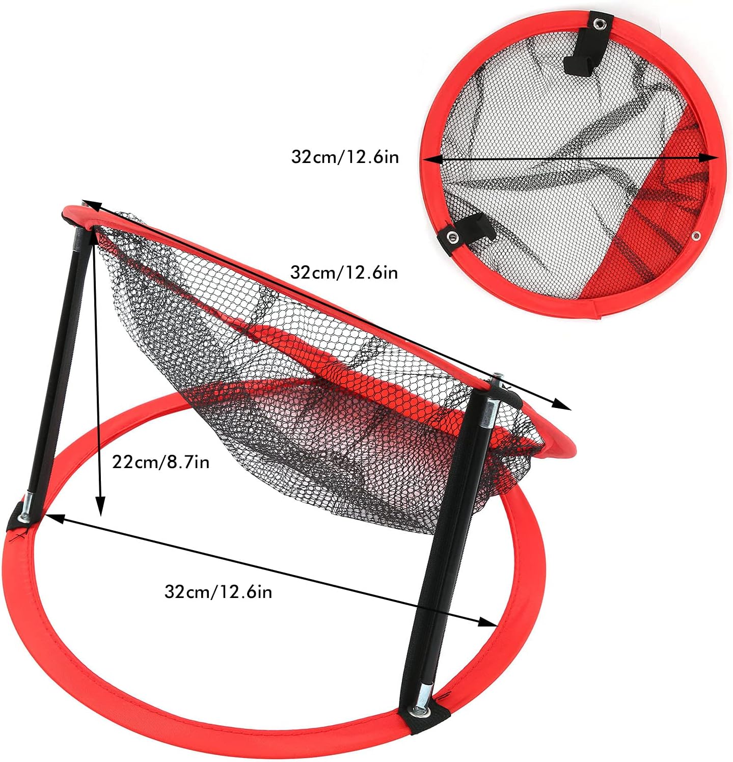 SpecificationsItem Type: 3 in 1 Golf Chipping Net SetMaterial: Nylon Cloth+Nylon Net+Collapsible Fiber Support RodSize: Large Size Net: Length: Approx. 62cm/24.4in Width: Approx. 62cm/24.4in Height: Approx. 48cm/18.9in Folded Diameter: Approx. 32cm/12.6in Unfolded Diameter: Approx. 62cm/24.4in Medium Size Net: Length: Approx. 46cm/18.1in Width: Approx. 46cm/18.1in Height: Approx. 35cm/13.8in Folded Diameter: Approx. 32cm/12.6in Unfolded Diameter: Approx. 42cm/16.5in Small Size Net: Length: Approx. 32cm/12.6in Width: Approx. 32cm/12.6in Height: Approx. 22cm/8.7in Folded Diameter: Approx. 32cm/12.6in Unfolded Diameter: Approx. 32cm/12.6inModel: Large/Medium/Small Net, 3PCS in 1 SetWeight: Approx. 392g/ 13.8ozColor: Black+RedUsage: 3 pieces/set: large represents the minimum difficulty, medium represents the moderate difficulty, small represents the greatest difficulty, different sizes of different cutting rod track helps to improve your cutting rod waterPackage List:3 × Golf Chipping Net 4 × Connecting Monotube2 × Connecting Double-Tube1 × Clothbag