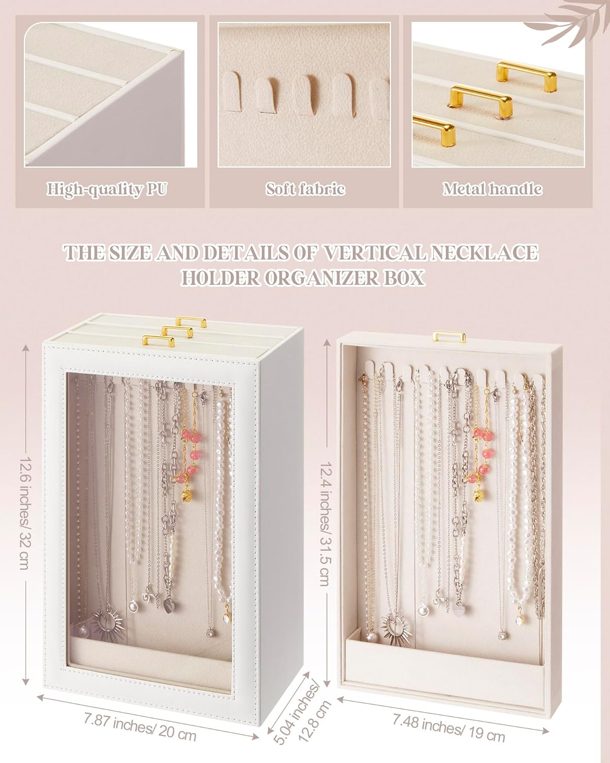Features: Practical daily jewelry organizer box: This vertical necklace holder is designed to solve the common problems of necklace storage, such as tangling, loss and dust accumulation. It provides a dedicated space for your necklaces, making your jewelry arrangement more neat and systematic. Whether you have delicate chain necklaces, statement necklaces with large pendants or layered necklaces, this box can accommodate them all. Space saving size: With its compact size of 12.6" x 7.9" x 5", the necklace storage box does not take up too much room and can be placed on any dresser, nightstand or vanity table. It integrates seamlessly into different home environments, whether you use it in the bedroom, dressing room or bathroom. The vertical design also helps save horizontal space compared with flat storage boxes, making it a practical choice for people with limited countertop areas who want to keep their necklaces well organized. Specifications: Material: PU, velvet Color: white Size: about 12.6" x 7.9" x 5" Package includes: 1 x Necklace organizer box Notes: Manual measurement, please allow slight errors on size. The color may exist a slight difference due to different screen displays