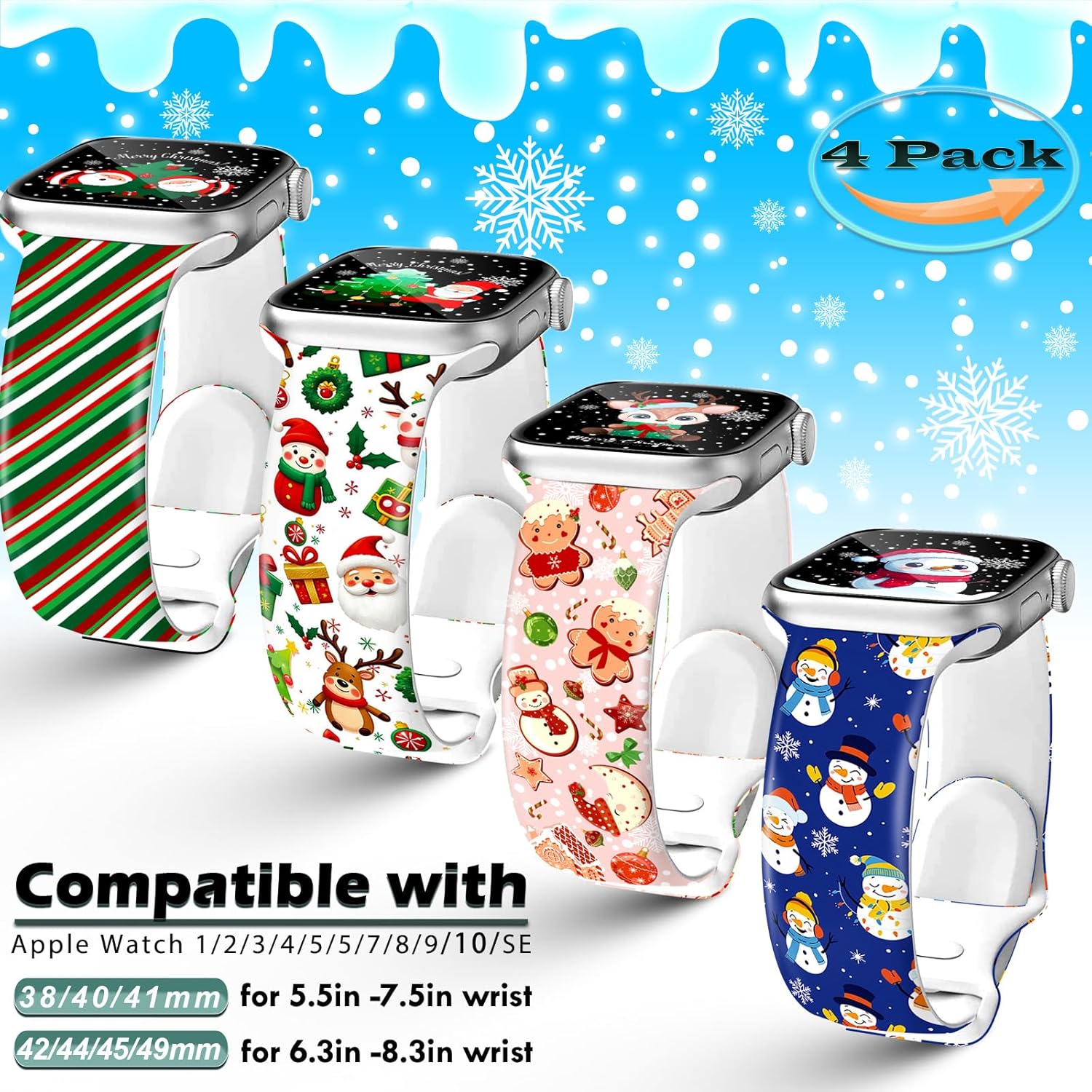 Why Choose ® Mylooverleo Christmas Thanksgiving Fall Watch Band Compatible with Apple Watch ? • Unique Pattern Design: the unique Christmas pattern with classic Xmas elements---Santa, Gnome, Snowman, reindeer, Xmas tree, snowflake is perfect for Christmas celebrations. They’re unique and cute Xmas gift for your lovely ones • Multiple Stylish Patterns & Colors Choices: Personalize your Watch with these Christmas prints bands to transform your apple watch into a festive accessory that celebrates the Christmas with a playful Xmas theme. You will get tons of compliments on how it’s stunning. • High Quality: Made of high-performance soft and smooth silicone, flexible, smooth, durable, lightweight, sweat-proof, waterproof and comfortable. • Clear Pattern & Fadeless: adopting advanced transfer technology to ensure that the pattern colors of the straps remain bright & non fading with unique xmas charms. • Compative with Apple Watch Models: Apple Watch (1st generation)38mm; Apple Watch (1st generation) 42mm; Apple Watch SE (2nd generation) 40mm; Apple Watch SE (2nd generation) 44mm; Apple Watch SE 40mm; Apple Watch SE 44mm; Apple Watch Series 1 38mm; Apple Watch Series 1 42mm; Apple Watch Series 10 42mm; Apple Watch Series 10 46mm; Apple Watch Series 2 38mm; Apple Watch Series 2 42mm; Apple Watch Series 3 38mm; Apple Watch Series 3 42mm; Apple Watch Series 4 40mm; Apple Watch Series 4 44mm; Apple Watch Series 5 40mm; Apple Watch Series 5 44mm; Apple Watch Series 6 40mm; Apple Watch Series 6 44mm; Apple Watch Series 7 41mm; Apple Watch Series 7 45mm; Apple Watch Series 8 41mm; Apple Watch Series 8 45mm; Apple Watch Series 9 41mm; Apple Watch Series 9 45mm; Apple Watch Ultra 2 49mm; Apple Watch Ultra 49mm • What you will get? •4 * Christmas Watch Bands