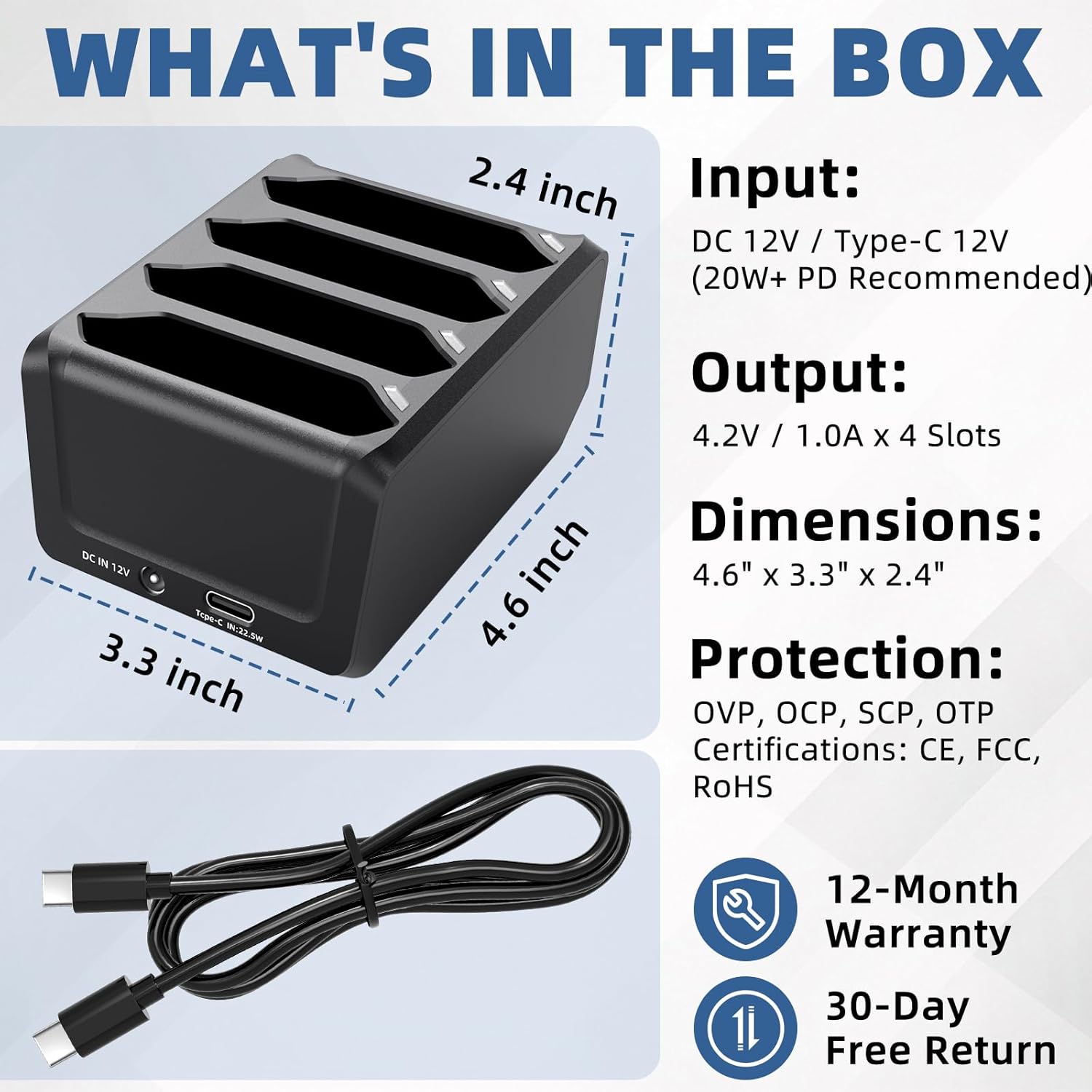 Streamline Your Warehouse Operations with FJP 4-Slot Battery ChargerKeep your fleet of Zebra TC7x scanners running continuously with our efficient 4-bay charging cradle. Designed for logistics centers, warehouses, and retail environments, this charger allows you to charge up to 4 spare batteries simultaneously, eliminating the clutter of multiple cables.๐ Key Upgrade: Dual Input OptionsUnlike old-fashioned chargers that require heavy proprietary bricks, our cradle features a modern USB Type-C port alongside a standard DC port. You can power it using a standard high-power USB-C PD wall charger, making it easier to deploy and transport. Technical Specifications:Model: 4-Slot Charger for TC7XDC Input: 12V / 4.16A (Round Port)Type-C Input: 12V / 22.5W MaxCharge Voltage: 4.2V / 1A per slotSlot Count: 4 Battery Bays โ ๏ธ Power Adapter Requirement (Important):This listing includes the Charger Dock and a Type-C Cable ONLY. The wall power adapter is NOT included. To ensure fast charging for all 4 slots simultaneously, please connect to a 30W (or higher) PD USB-C Charger or a 12V/4A DC Adapter. Using a low-power phone charger (5V/1A) may result in slow charging. Comprehensive Compatibility List:โ Compatible with Zebra / Motorola / Symbol Handheld Computers: - TC77 Series: TC77, TC77HL (Touch Computer) - TC72 Series: TC72, TC720L - TC75 Series: TC75, TC75x, TC75FK - TC70 Series: TC70, TC70xโ Compatible with Battery Part Numbers: - BTRY-TC7X-46MAH-01 - BTRY-TC7X-46MAH-02 - BTRY-TC7X-46MA1-01 - BTRY-TC7X-46MA2-01 Package Contents: 1 x 4-Slot Battery Charging Cradle 1 x USB Type-C Cable 1 x User Manual