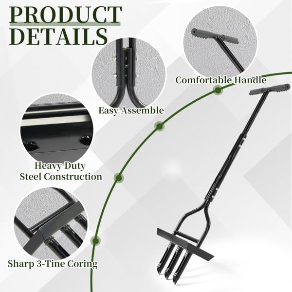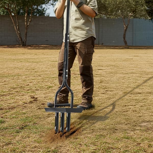 Every gardener knows the secret to a lush green yard is healthy soil that breathes, absorbs water, and welcomes nutrients. This 43‑inch manual aerator was designed with that idea in mind—crafted for those who take pride in every blade of grass. Measuring just over three feet long, the tool features three precision‑cut steel tines that dig into compacted ground, lifting plugs of earth to open tiny channels through which air and moisture can flow freely. As you press your foot on the flat base, the tines pierce smoothly while the built‑in core tray collects the extracted plugs, eliminating messy cleanup and keeping your paths tidy. Its heavy‑gauge steel construction resists rust, promising dependable performance year after year. The padded horizontal handle allows you to maintain a steady grip, so each motion feels balanced and controlled. When the tines get filled, simply use the included cleaning stick to clear debris or switch roles and use it for weeding between flower beds. With each aeration session, you’ll see your turf transform—roots strengthen, color deepens, and rainfall penetrates more efficiently. From small suburban yards to larger garden spaces, this rugged tool becomes an essential partner for restoring vitality to your lawn naturally and effortlessly.