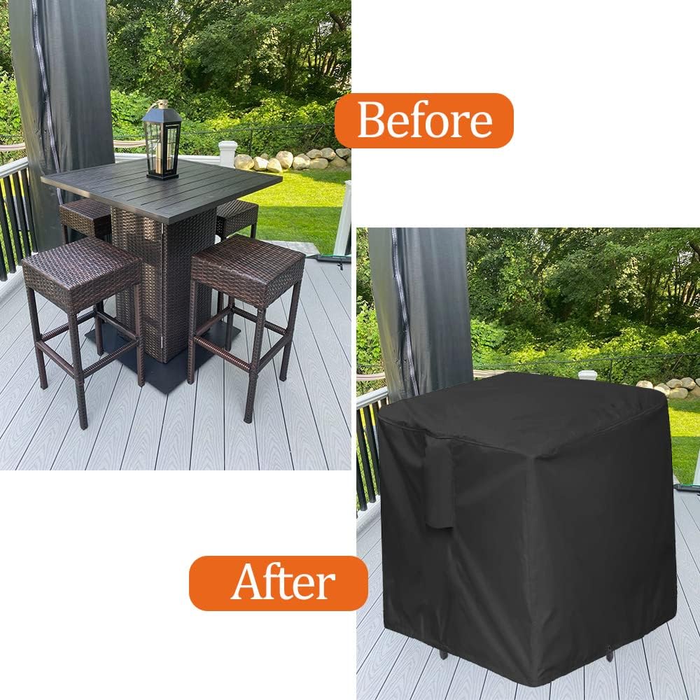 60 Inch Square Patio Bar Table & Chair Set Cover for 5-Piece Outdoor Wicker Bar Table Set Patio Bar Set Cover - Made of very thick fabric! Great at keeping the patio furniture looking better for much longer. It has flaps to put around furniture legs and have stayed put all winter. Padded Handles - Easy to put on and remove. It’s easy to fold up when not in use.