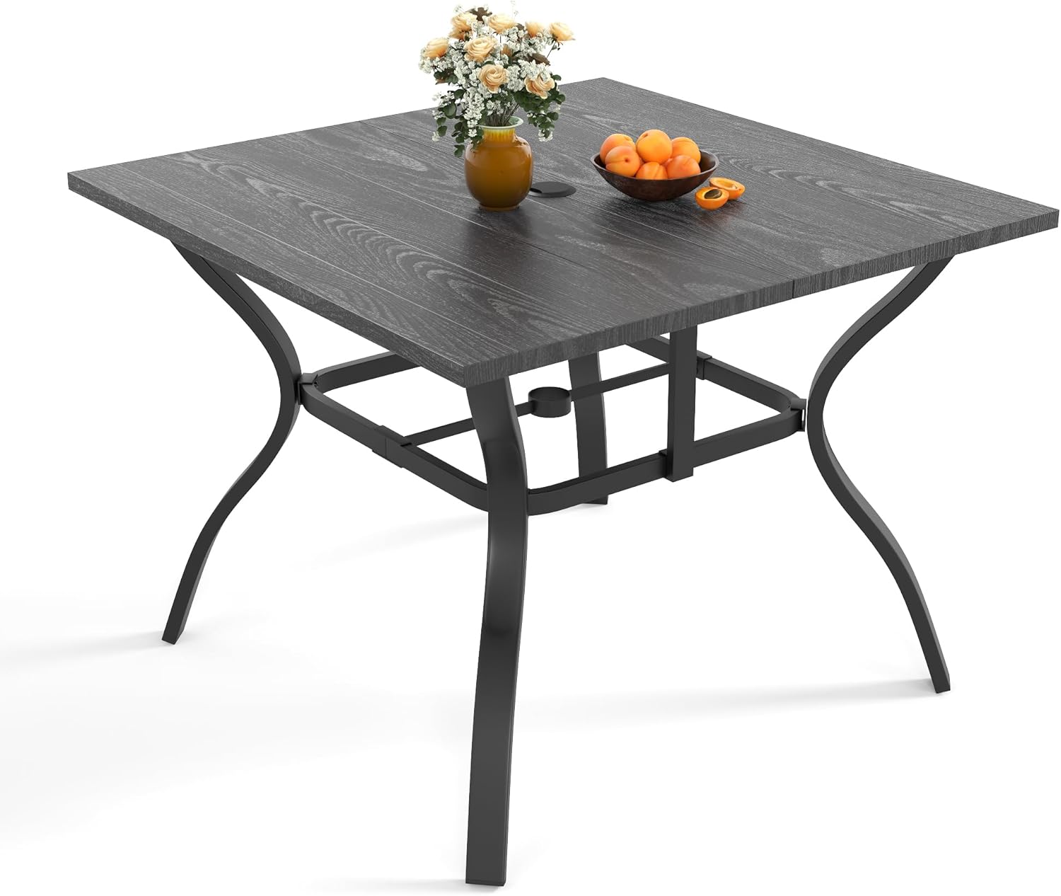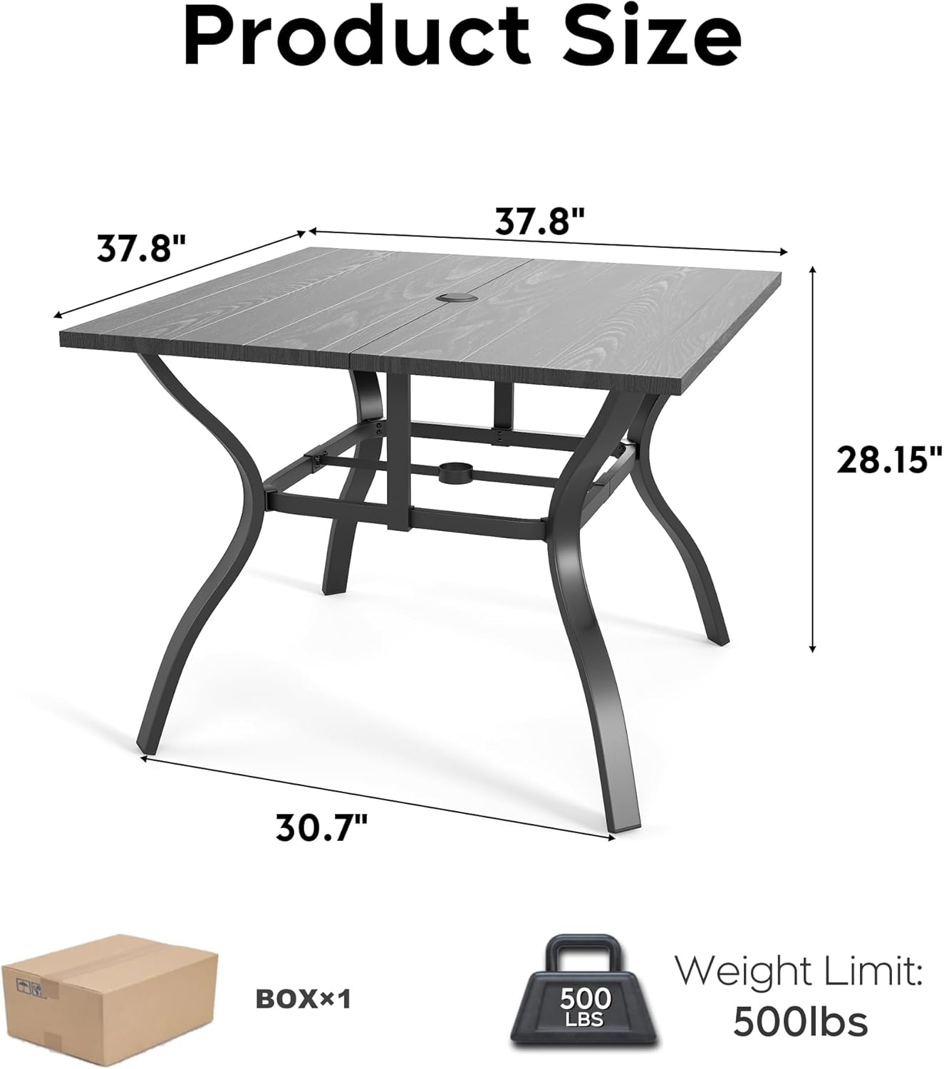 Where Vintage Aesthetics Meet Heavy-Duty Functionality – Redefining Your Outdoor Living This 5-piece outdoor dining set masterfully blends industrial-grade durability with contemporary style. The table features a high-strength metal frame paired with a vintage wood grain tabletop – not just functional furniture, but a stunning focal point that elevates any space. Equipped with a 1.97-inch standard umbrella hole, it seamlessly fits patio umbrellas, providing instant shade for family parties or outdoor dining – enjoy your time without the glare. The four chairs each support an impressive 350 lbs, with a widened seat design that contours to your spine, delivering excellent lumbar support even during extended use. Crafted from waterproof, wear-resistant Textilene fabric, the seats resist fading and are effortless to clean – a simple wipe restores their like-new appearance. The metal frames feature a powder-coated finish for superior rust and corrosion resistance, standing strong in humid outdoor environments. Reinforced thick metal table legs ensure rock-solid stability, while the slatted tabletop promotes quick water drainage, preventing puddles. The table adapts seamlessly as a dining table, kitchen island, or work desk, while the chairs fold flat for compact storage. Perfect for family gatherings, restaurant use, or patio relaxation – this set delivers versatility and style in one complete package.