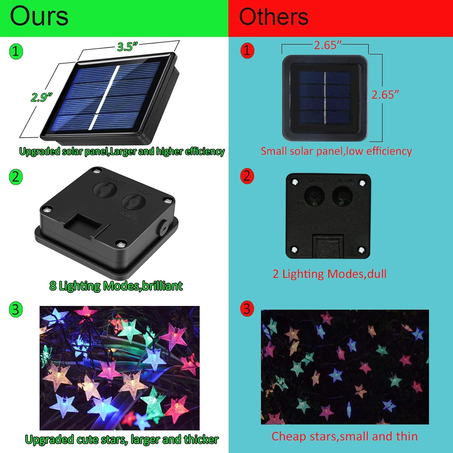 Solar String Lights for Home & House Hang the star string lights on wall, window, stairs, apartment balcony to create fabulous, warm atmosphere. Go for the house edges to adjust a string of LEDs to the corners of walls and roofs. Solar Ambiance Lights for Garden Yard Makes your garden a fairy world with this wonderful star lights, it could be used as patio post lights, backyard fence lights, deck lights, or any gazebo ambiance lights, very festive for any season. Everyone will love the stars and the twinkling options. Solar Outdoor Lights for Camping Tent Very beautiful solar lights for camping/camper/campersite/garthering space, also great solar lights for chicken coop, easiy hang up, use the solar energy as your friend, no outlet no wire and no electric bills! Highlight Remarkable Objects Using these solar decorative lights to highlight all of garden ornaments such as fountains, fences, bushes, campers, awning camping, trees, deck, dinner tables or couches in your backyard, making your garden space much more inviting. Specifications: - LED Count: 120 pcs - Light Color: Multi-color - Power Source: Solar Energy - Solar panel: 2V 100mA - Ni-Mh batteries: 1200 mAh - Charging time: 8-10 hours - Working time: 10-12 hours - Waterproof: IP65 - Lead Wire Length: 6.5ft/2 Meters - Total Length: 55ft/17 Meters - Space Between Bulbs: 4.9 inches/12.5cm - Star Diameter: 1.6 inches/4cm - Weight: 0.6kg Package includes: 1 x Abkshine 120 leds solar star string lights 1 x Solar Panel 1 x User Manual Note: 1. Make sure the switch of the lights is turned to "ON" status, if not, the battery will not be charged. 2. When winter comes, there may be insufficient energy due to insufficient sunlight, please place solar panel in direct sunlight to ensure that it receives sufficient solar energy.