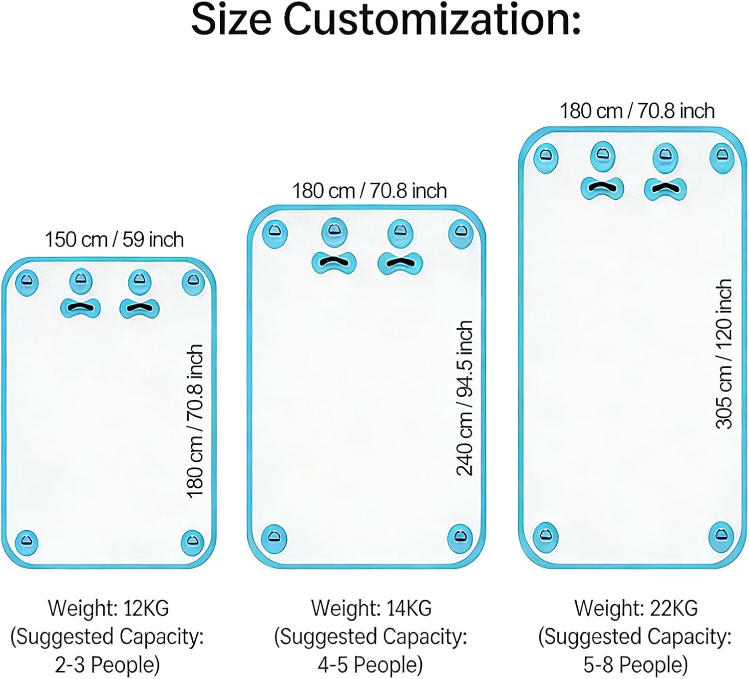Elevate Your Water Adventures with Our Premium Inflatable Floating Dock!Turn your days on the water into unforgettable moments with our ultra-stable, versatile inflatable platform—ideal for boating, fishing, yoga, or relaxing with loved ones.Key Features- 6" Thick Core: Unbeatable buoyancy & stability for safe, worry-free fun- Leak-Proof Valve: High-seal design keeps your dock inflated all day- Removable 4-Step Ladder: Effortlessly climb on/off the water platform- Dual-Layer Seams: 100% waterproof & tear-resistant for long-lasting durabilityPick Your Size- 180×150×15 cm (12kg): For 2-3 people- 180×240×15 cm (14kg): For 4-5 people- 180×300×15 cm (22kg): For 5-8 peopleWhat’s IncludedInflatable dock, removable rope ladder, manual pump (with pressure gauge), repair kit, durable carry bagVersatile FunUse it as a fishing dock, yoga mat, swim platform, or backyard retreat. Quick inflate/deflate and a compact carry bag make it easy to take anywhere!Important Safety NoteAlways fully inflate and secure the dock to a stable anchor (e.g., a boat) before use. Do not exceed the recommended weight capacity for your chosen size.
