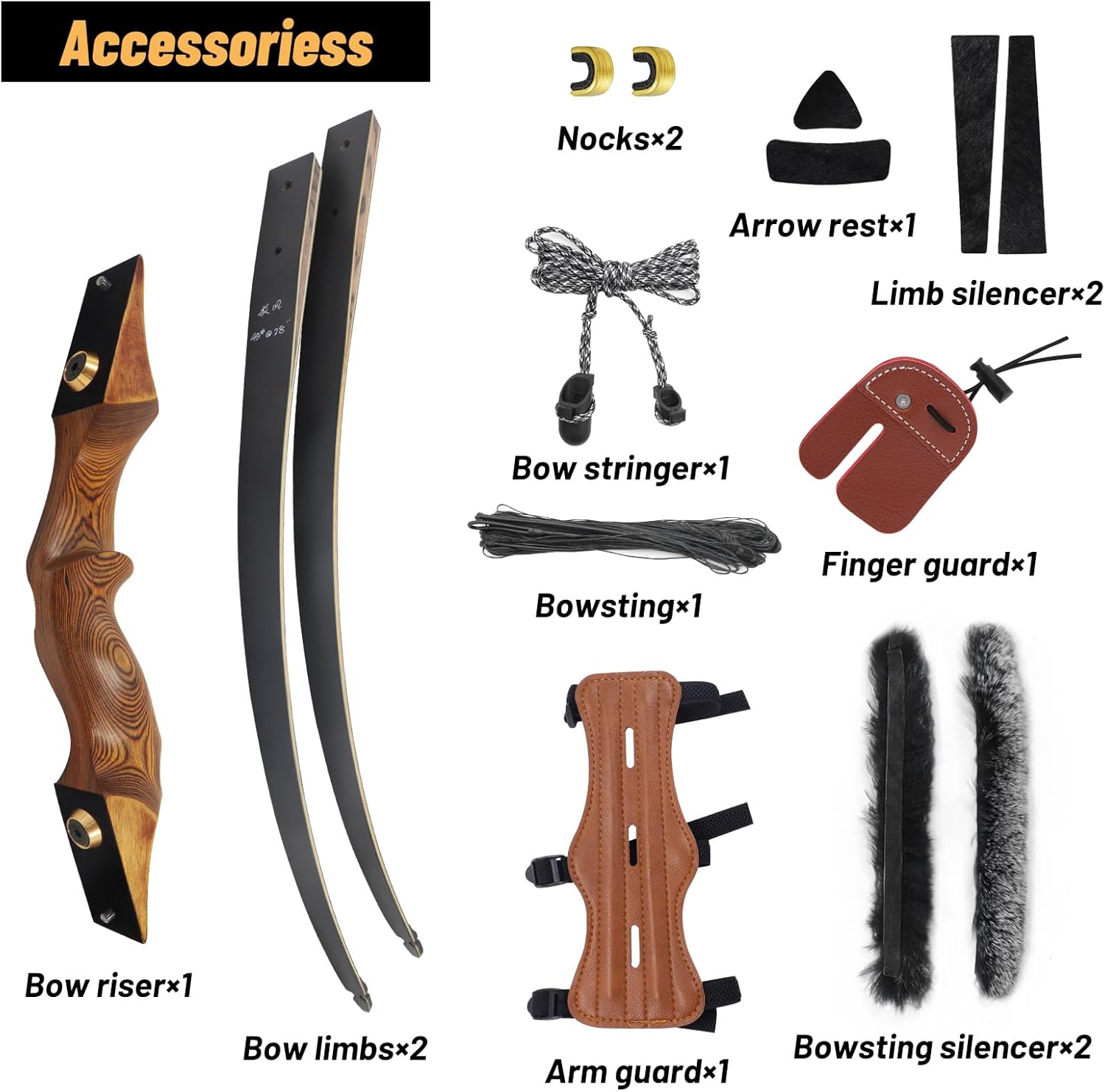 Item Name: 60" takedown longbow Draw weight:20-60 lbs Bow length: 60inch Bowstring: 145cm/57inch (Dyneema string material ) Bow handle length: 15 inch Max draw length: 30 inch Brace height: 7-8 inch Bow riser material: High-density technology wood Bow limb material: fiberglass and bamboo core Bow Limb technology: Lamination Packing: 1 takedown longbow 2 bowstring silencers 2 limb silencers 1 arrow rest 1 arm guard 1 finger tab 1 bow stringer 2 nocks User Notice:NEVER DRY FIRE (shooting without an arrow).Do not exceed the draw weight, or it will damage the limbs.Do not attach the arrow to the bow for a long time, or it will reduce the draw weight.Due to differences in manual measurement and display, there may be slight errors in color and size. Thank you for your understanding.