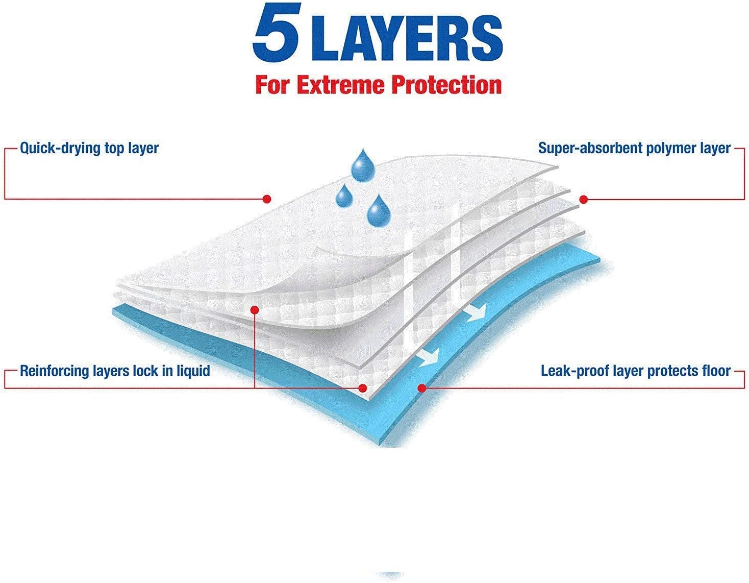 5-layers including a layer of S.A.P. (super absorbent polymer) makes these pads some of the most absorbent in the business. Can be reused for up to 8hrs. Great for pooch's with an active bladder or other medical issues that might cause excessive urination. Half life for 2 dogs totaling 30lbs. Comes 300 per case