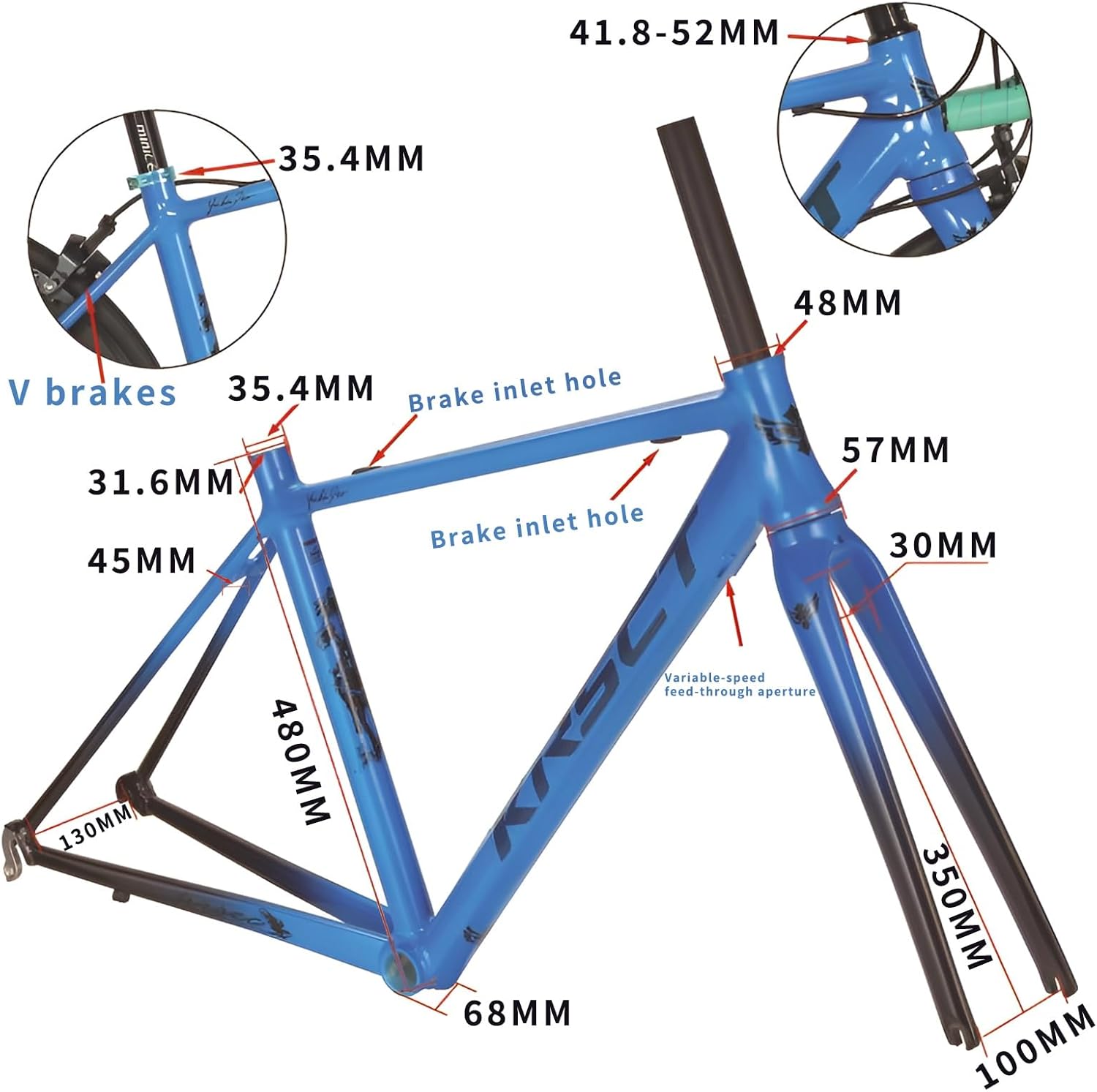 700C Road Bike Frameset V Brake Aluminum Alloy Bike Frame 44cm Lightweight QR Frame 100/130mm With Carbon ForkFrame: V-brake aluminium alloy frameFork: Ultra-lightweight full carbon fibre tapered forkFrame size: 44cmFork + frame weight: 1420g + 360gRecommended height: 150–160cmHeadset: 41.8–52mmStandover height: Front 100mm, Rear 130mmBottom bracket: BSA 68mmSeatpost: 31.6mmSeatpost clamp: 35.4mmTyres: Maximum 25C outer tyre (compatible with 28C)Packaging: 1× Aluminium alloy frameNotice:1. Due to different shooting angles, there will be chromatic aberration problems, because there will be 1-2cm error due to manual measurement, please understand.2. If you have any questions, please feel free to contact us, we will reply you in time.