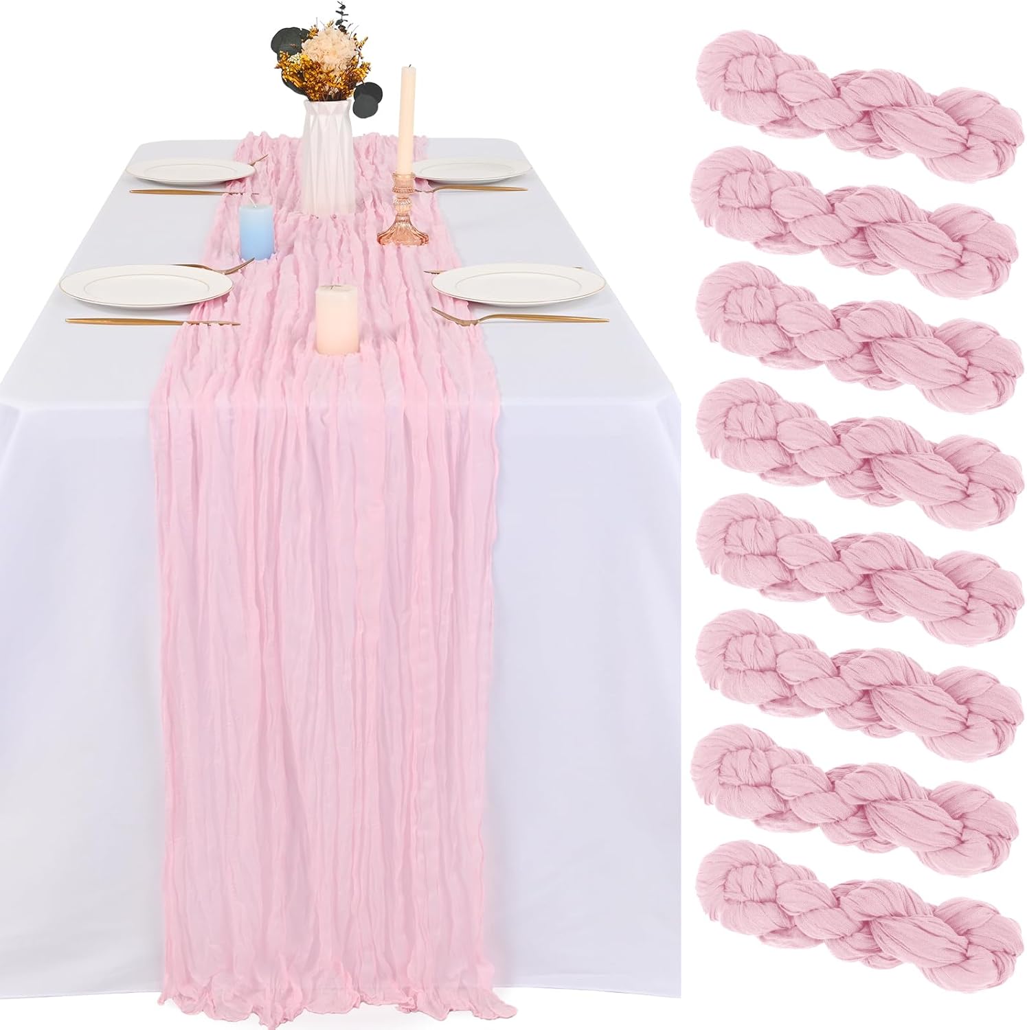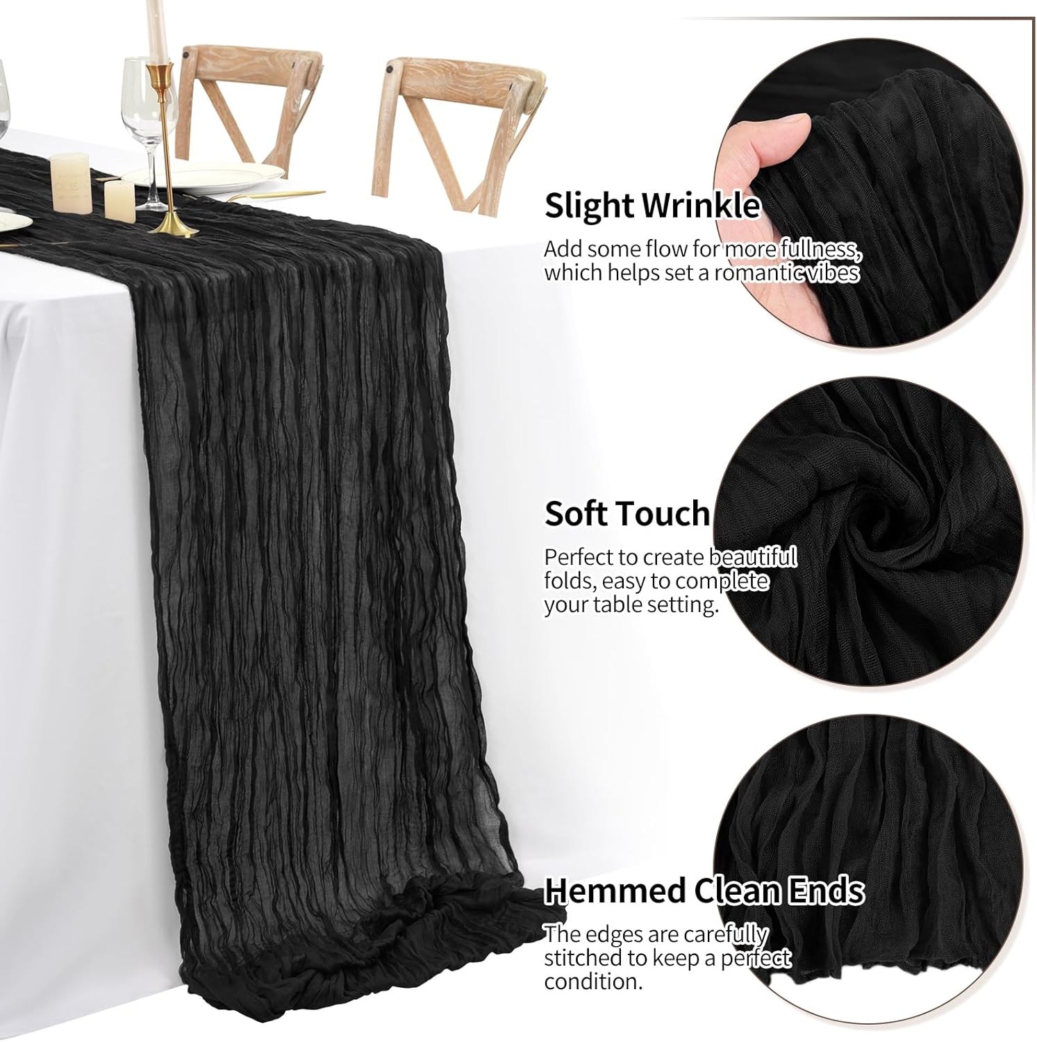 Specification:Quantity: 8 PACKSMaterial: High Quality PolyesterSize: 35" W x 120"L/10FtStyle: Romantic & VintageColor: BlackFeatures:Fits to all types of tableTable runner size is 10ft/ 120 in/ 304cm long and 35 in/ 90 cm width. Cheesecloth Gauze table runner perfectly fits in the interior of bridal table decor, wedding table, gardens, picnic table, and even a cozy cafe table or a studio indoor.Multifunctional Tablecloth RunnerGreat for rustic weddings or bohemian themed parties, sand ceremonies, reception area or backdrop decoration, wedding chairs, gauze napkins or a gift wrap100% Real MaterialThe touch of cotton, the long-lasting of polyester. Compared with the easily damaged material of pure cotton on the market, we are more long-lasting and can withstand multiple cleanings without damage or fading.Package Includes:8 x Black Cheesecloth Table RunnerNotes:Manual measurement, there will be an error of 1-3cm.The color may exist slight difference due to different screen display.If you have any questions, please feel free to contact us.