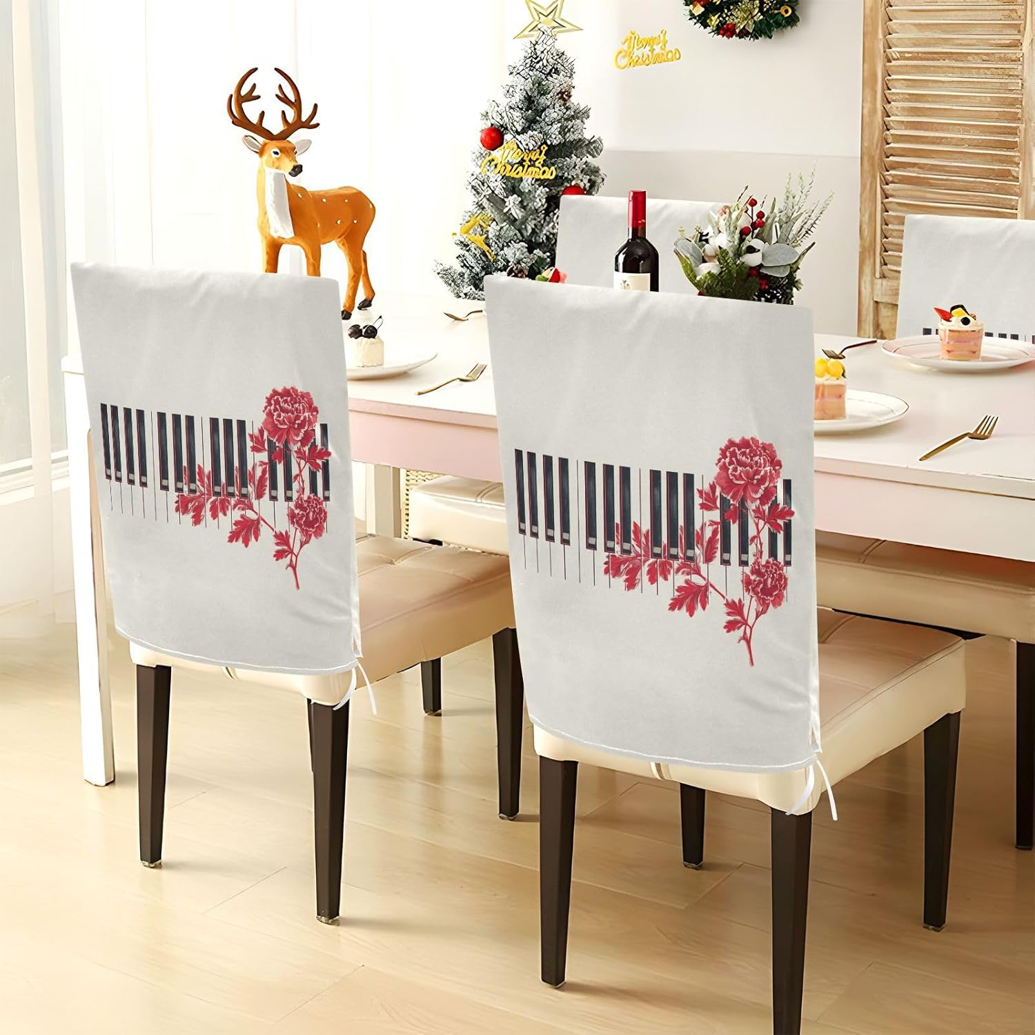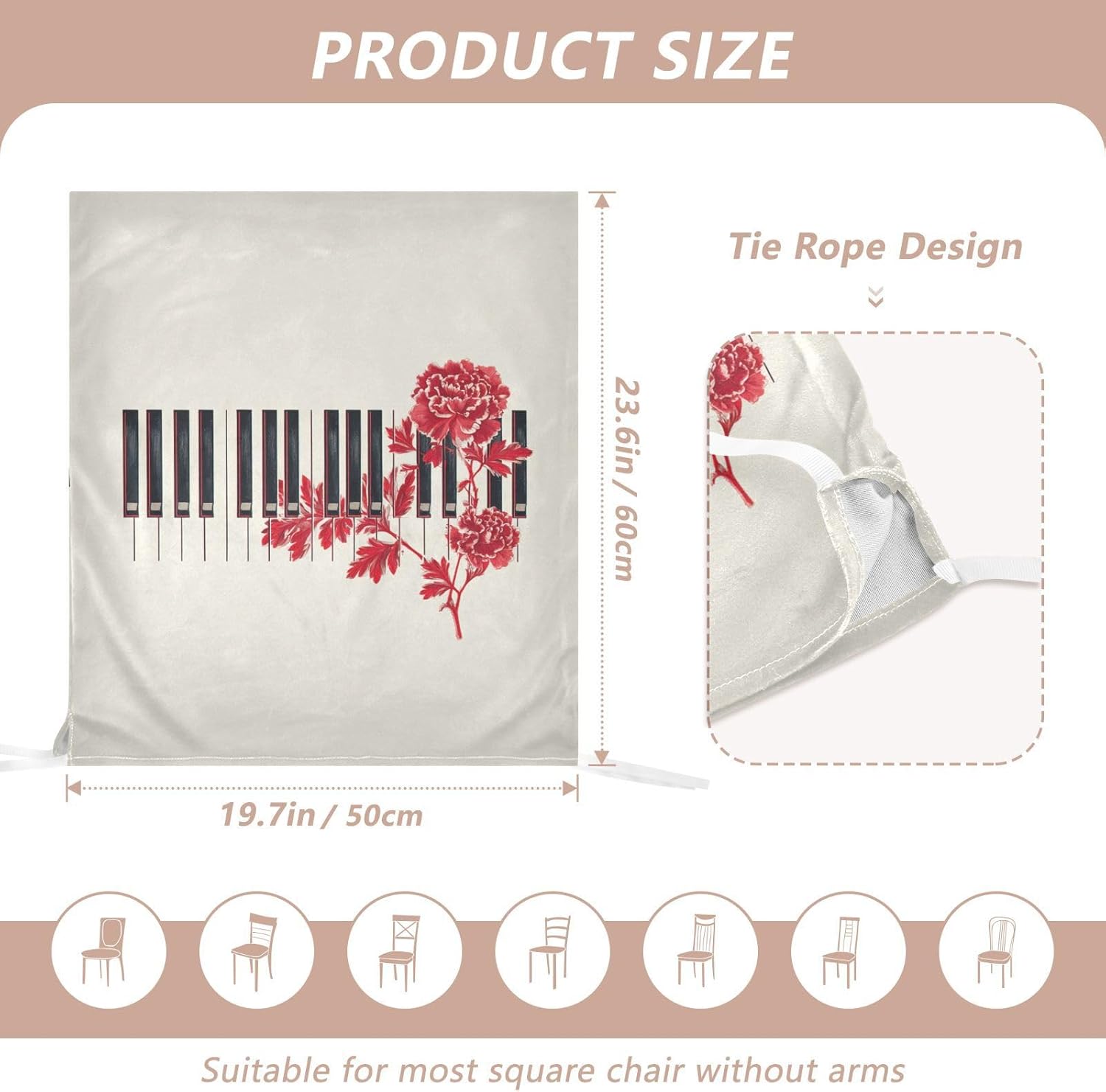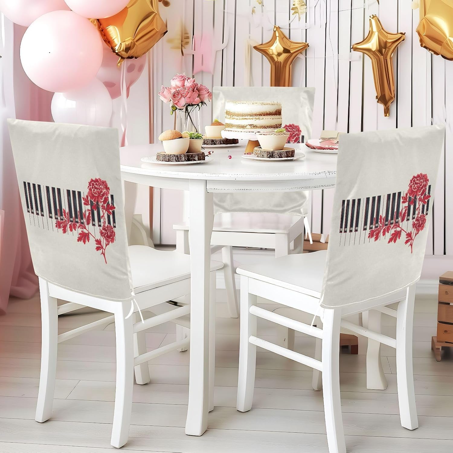 Chair Cover Material made of polyester,comfortable and soft to touch,reusable and suitable for long term use Features easy to install and remove, tie rope design at the bottom,machine washable Stylish Chair Decoration With beautiful pattern,it can be used for family party/ birthday party/wedding/ holiday party to add atmosphere, also can be used for chair decoration in living room, dorm, kitchen dining room,bedroom to bring protection to the chair while avoiding stains to dirty the chair back. Easy To Care Machine washable, Not washing with hot water, Not bleaching