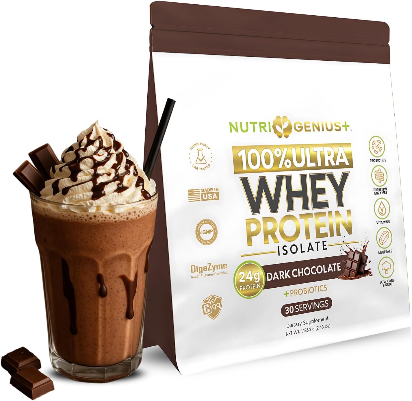Fuel your body with Nutrigenius+ Whey Protein Isolate, the ultimate blend of 24g of high-quality protein, probiotics, digestive enzymes, vitamins, and minerals designed to support muscle recovery, digestion, immune health, and overall wellness. Support Muscle Growth & Recovery: High Protein Content: Each serving provides 22–24g of fast-absorbing protein, essential for muscle repair and growth. Rich in BCAAs: Contains 5g of branched-chain amino acids (BCAAs), including 2.4g of leucine, which play a crucial role in muscle protein synthesis and recovery. 🧠 Support Digestive & Immune Support: Probiotics & Digestive Enzymes: Formulated with added probiotics and digestive enzymes to enhance gut health and nutrient absorption. Essential Vitamins & Minerals: Includes a blend of vitamins and minerals to support overall well-being and immune function. ⚖️ Support Weight Management & Nutrition Low Calorie & Low Fat: Offers a lean nutritional profile with approximately 22 calories and 2g of fat per serving, making it suitable for weight management. Dietary Fiber: Contains 3g of dietary fiber per serving to promote satiety and support digestive health.