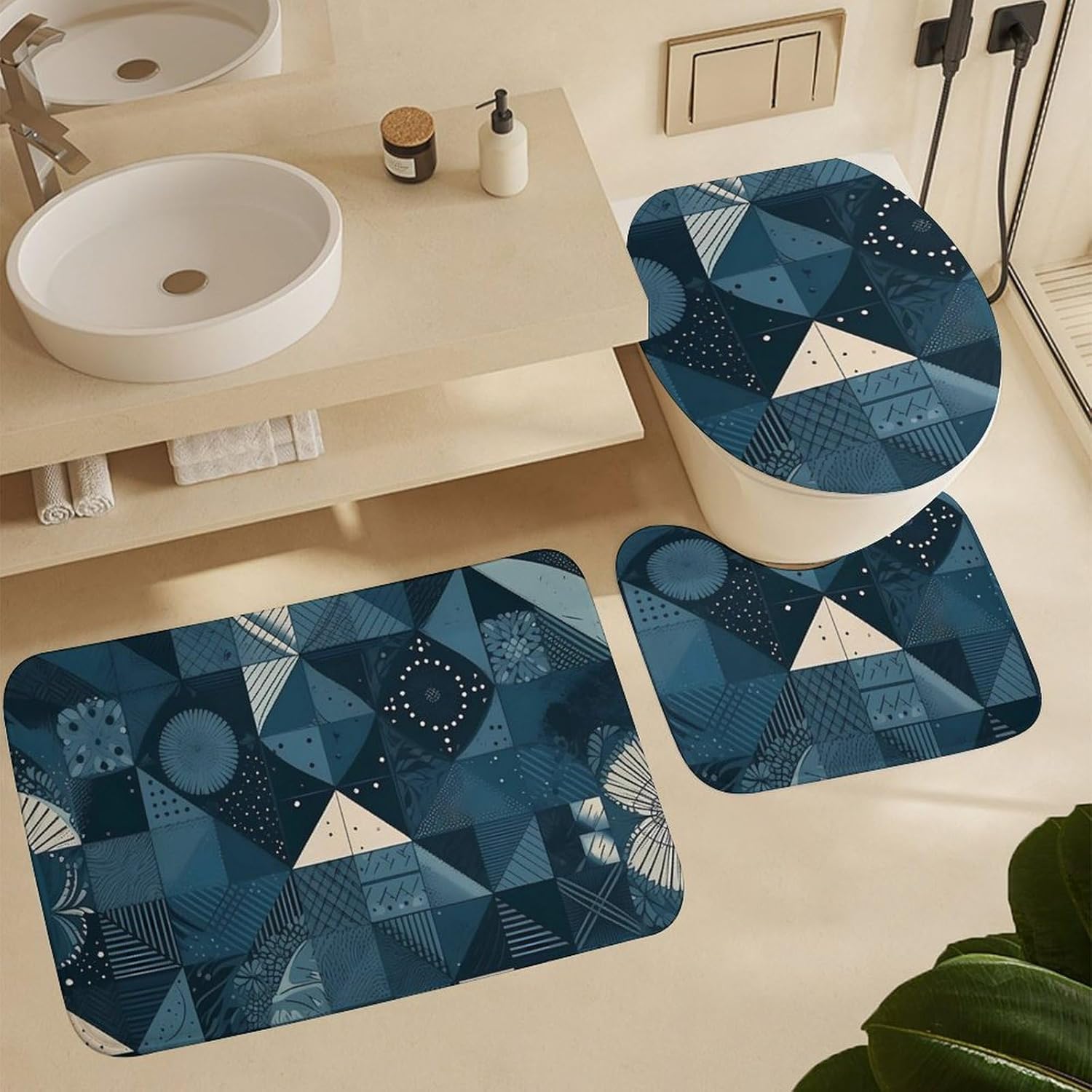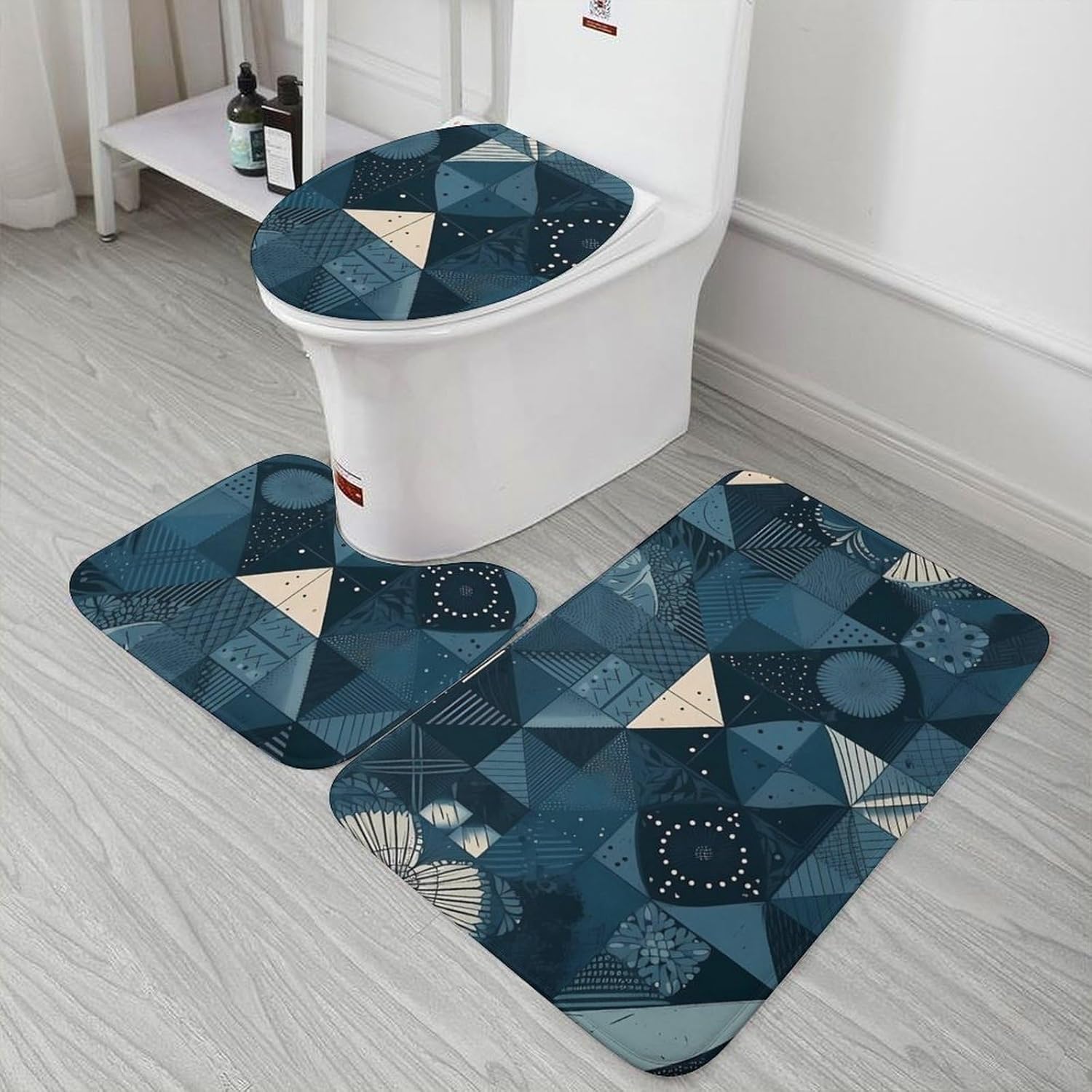 The Blue Geometric Pattern printed bathroom mat set provides a soft and comfortable surface for your feet. Whether you are taking a shower, getting ready for the day, or resting at night, this rug provides you with a comfortable place to step on The Soft bathroom mat contour mats and cover cover Suitable for home bathrooms, guest rooms, bedrooms, living rooms and other places, Washable, not machine washable