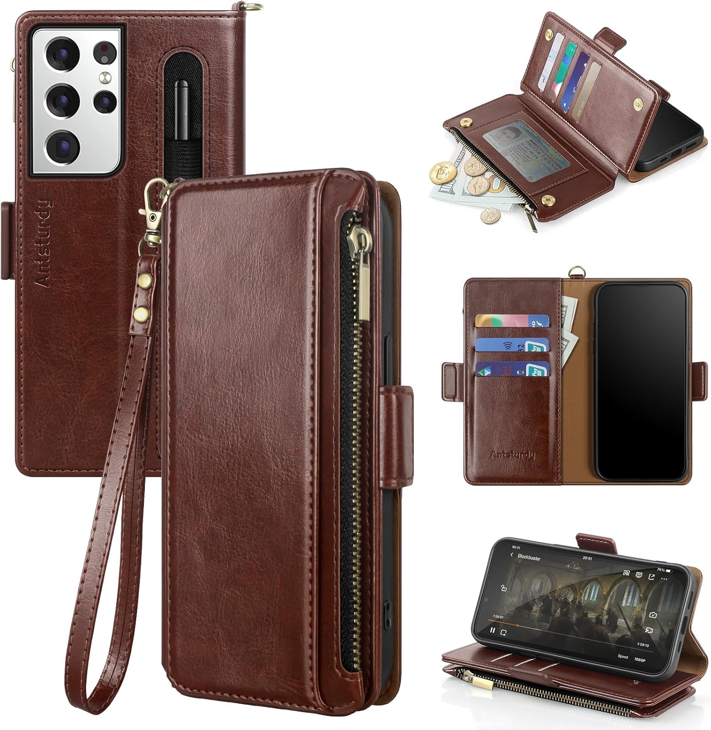 Antsturdy Compatible with Samsung Galaxy S21 Ultra 5G Wallet Case with Card Holder [RFID Blocking] [Zipper Poket] PU Leather Folio Flip Phone Case Shockproof Protective Cover with Wrist Strap Credit Card Slots Kickstand Function Shockproof TPU Men Women