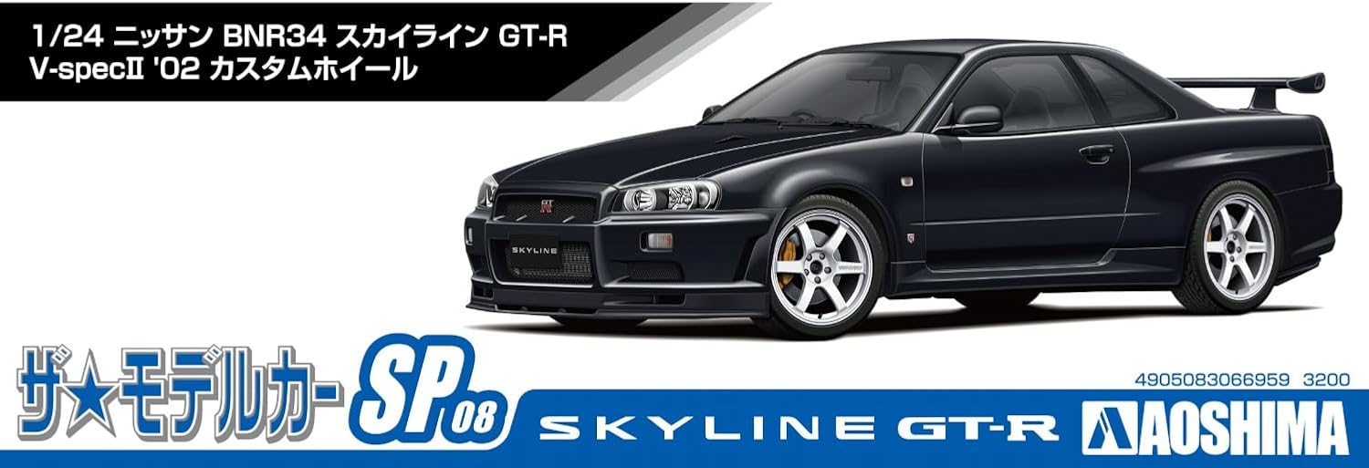 From Aoshima Bunka Kyozai Co. Aoshima brings us a model kit of the Nissan BNR34 Skyline GT-R V-SPECII from 2002 with custom wheels —the leader of the sports car world! Window frame masking stickers and 18-inch TE37RT wheels are included.