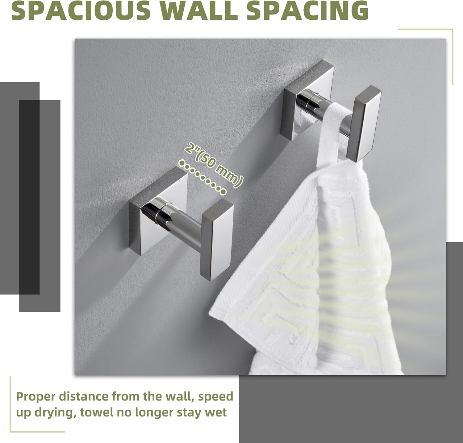 Polished ChromeInstallation Method: Wall MountedTOILET PAPER HOLDER WITH SHELFMaterial: 304 Stainless SteelDimensions:L 6-7/8" x D 5-5/16" x H 3-3/8" (174 x 135 x 85 mm)Net Weight: 1.19 lbs. (542 g)BATH TOWEL HOOK 2 PACKMaterial: 304 Stainless SteelDimensions: 1-3/4" x 2-3/8" x 2-1/4"(44 x 60 x 57 mm)Net Weight: 0.22 lb (102 g) per pieceCARE AND MAINTENANCE1.ONLY clean with a soft, damp cloth gently.2.DO NOT USE detergents as they may harm the protective finish of your bath accessories.3.Maintenance period is 1-2 months, this care will maintain the metallic gloss finish.WARM PROMPT1.NOTE: All photography props are NOT included in the package.2.Manual measure may occurs a little dimension deviation, please in kind prevail.3.Due to light influence and display resolution, pictures and objects may have slightly color aberration.