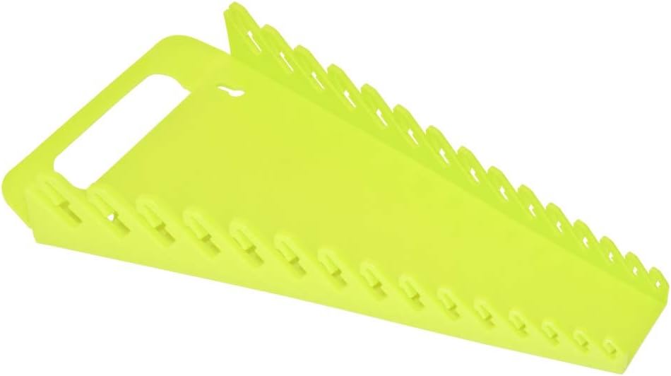 Ernst's 5082HV + 5182HV "Hi-Viz" Yellow Gripper Wrench Organizer 2PC Set, helps you maximize drawer space for your wrenches with 1 Forward and 1 Reverse Gripper. This combo set also keeps your wrench's EZ-to-see even in bad lit areas. These superior organizers provide the ultimate in tool-box storage and/or the Wrench Gripper are PegBoard-Friendly and allows you to securely transport wrenches to the job site. --- They accommodate a wide variety of wrenches and allow for immediate recognition of a missing wrench. The wrench organizers are made from soft, flexible "Hi-Viz" material. They also allow for easy one-handed engagement and removal of wrenches. Fuel and solvent resistant, made from Eco-friendly recycled products. -- 2PC Set Includes: 5082HV Hi-Viz Yellow Forward Gripper Holds 15 Wrenches (13¾" L x 7½" W x 1¾" H) Weight: 0.410 lbs. -- 5182HV Hi-Viz Yellow Reverse Gripper Holds 15 Wrenches - (12¾" L x 7½" W x 1¾" H) Weight: 0.365 lbs. -- American Engineered and Made in the USA. --- Tools in picture NOT INCLUDED.