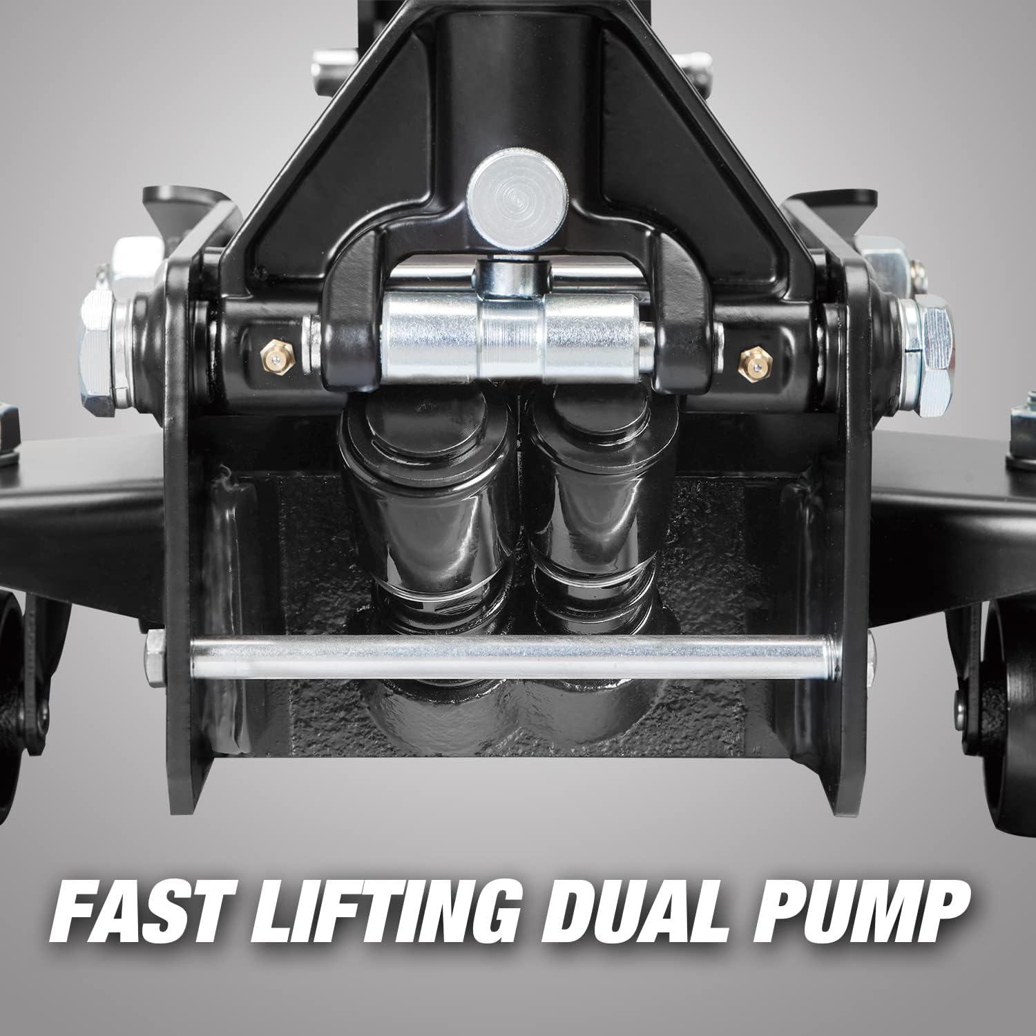 Road Dawg's 3 Ton heavy-duty jack, multi-function, multi-position lifting, with good load-bearing structure, high-density stainless steel material, has been welcomed by consumers around the world, its characteristics: High Position & Low Profile with Lifting range from 3.86" to 30.12". Quick lift function. The dual piston pump lifts loads 5 times faster than a single pump and is ideal for most cars, trucks, and SUVs. Equipped with (2) large steel casters and (2) 360-degree swivel casters for smooth maneuverability. In terms of safety, this Torin service jack even comes with a built-in safety overload system which prevents use beyond load capacity. Wide stance provides added stability under load. Includes a 1 year limited manufacturer.