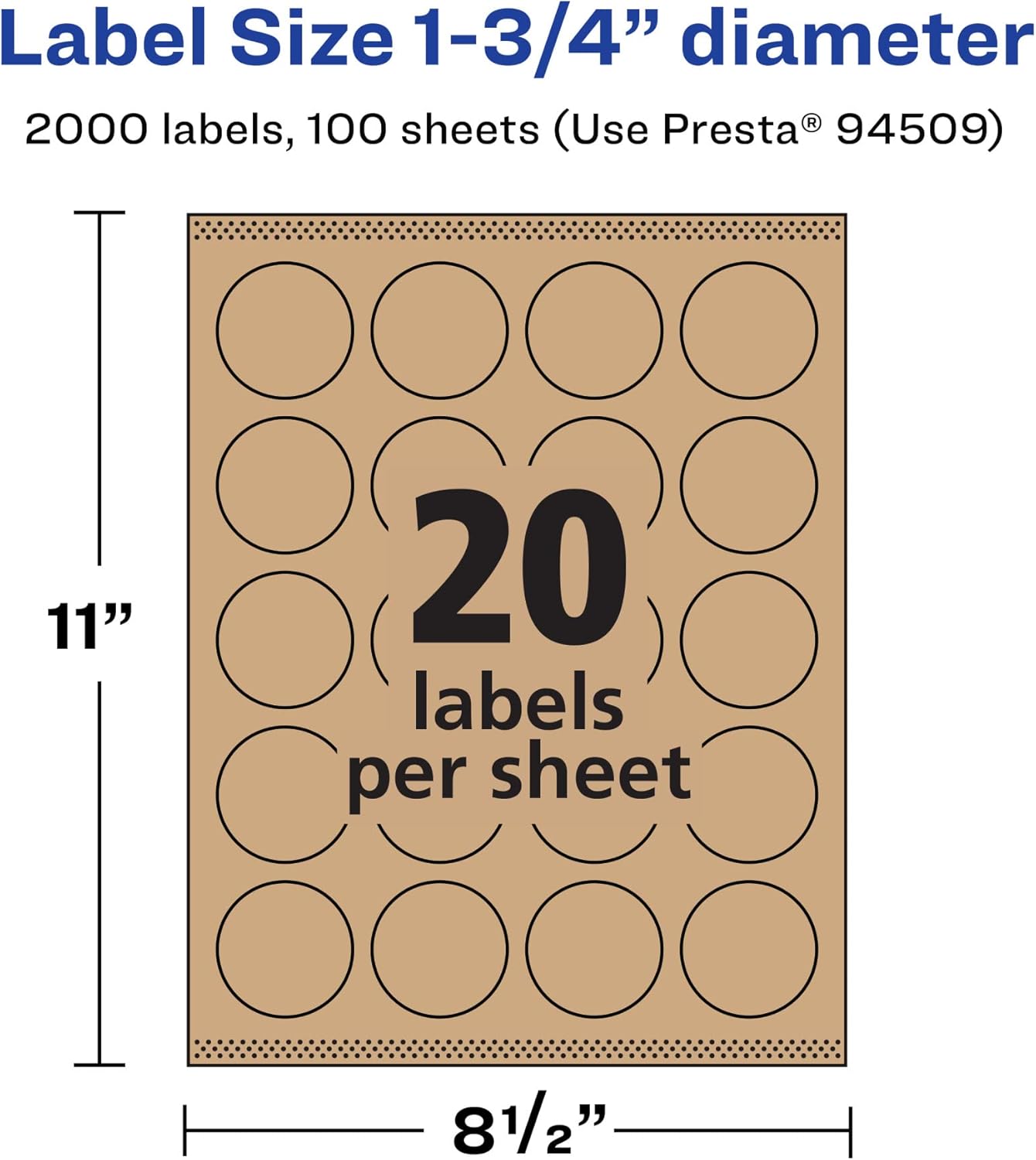 Easily add a rustic finish to crafts, gifts and products with Avery 1.75" diameter Kraft Brown Round Labels. Made with a kraft brown paper material that's smooth to the touch, Avery kraft brown labels add a natural and handcrafted look to any project. This charming kraft brown material is perfect for adding a little homespun flair to mailing seals, candle labels, pricing labels, soap labels, product labels, round spice labels, mason jar labels and more.Avery round labels are carefully constructed and developed with patented features to provide the best results for every project. Sure Feed technology prevents jams or smudges by creating a more reliable feed through your printer. The print-to-the-edge layout lets you print beautiful full-bleed designs that fill each blank sticker to the edge. The patented Easy Peel label design makes these labels easy to peel and quick to apply. Just bend the label sheet, peel off your labels and fold the sheet back flat. The strong permanent label adhesive makes sure that your labels stick and stay to a variety of surfaces without peeling, curling or falling off. Easily customize labels with your own designs, art, symbols and messaging by using the label templates and designs on the Avery website. The intuitive tools make it easy to add your personal touch to any project.