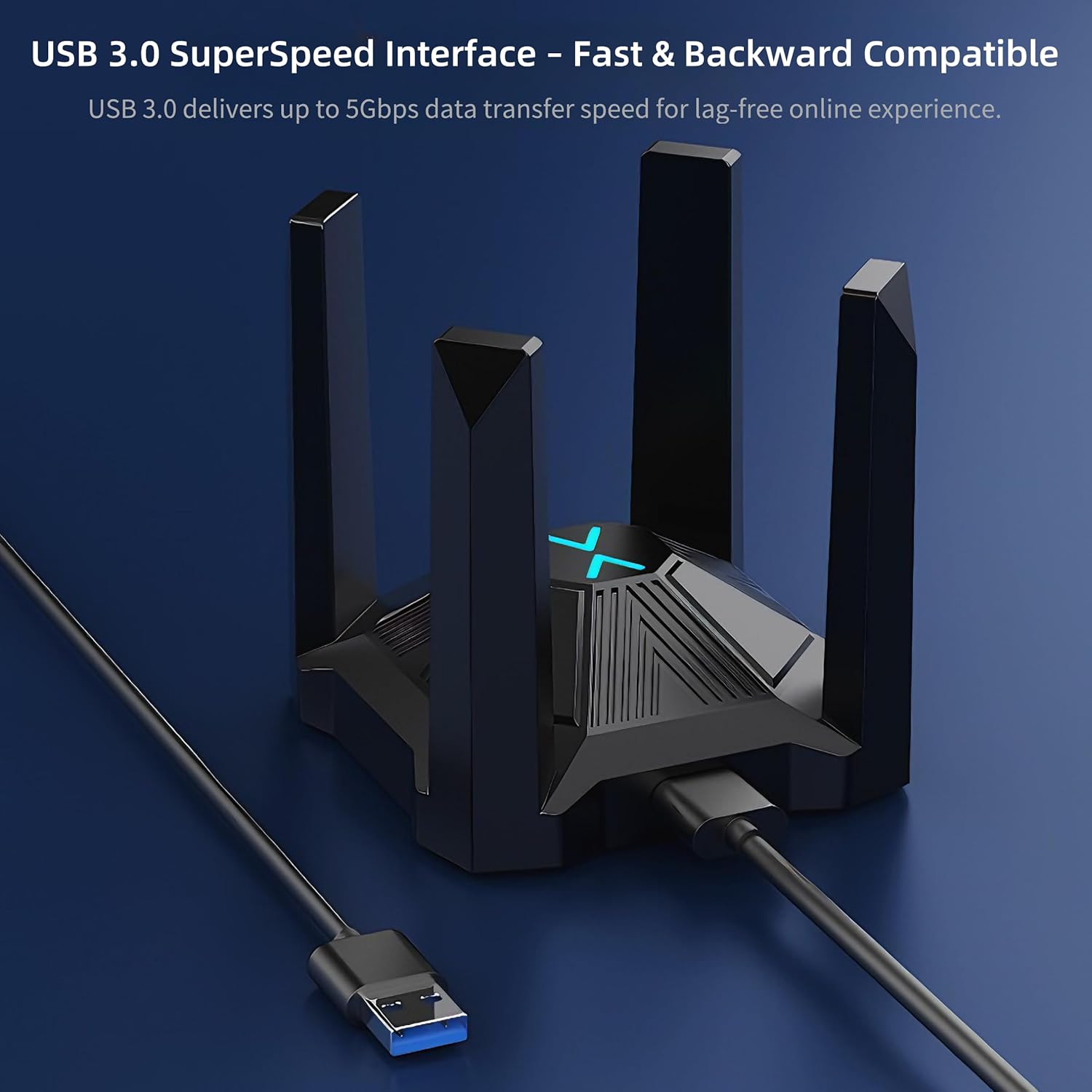 This AX1800 Wi-Fi 6 USB adapter offers dual-band speeds (573.5Mbps + 1201Mbps) using 802.11ax, OFDMA, and MU-MIMO. Features four fixed 3dBi antennas for improved signal coverage and wall penetration—no rotation needed. Plug-and-play for Windows 10/11 only; no driver install required. USB 3.0 interface ensures fast connectivity. Supports both Wi-Fi receive and hotspot modes. Ideal for desktops, gaming, and home office. No Bluetooth functionality.