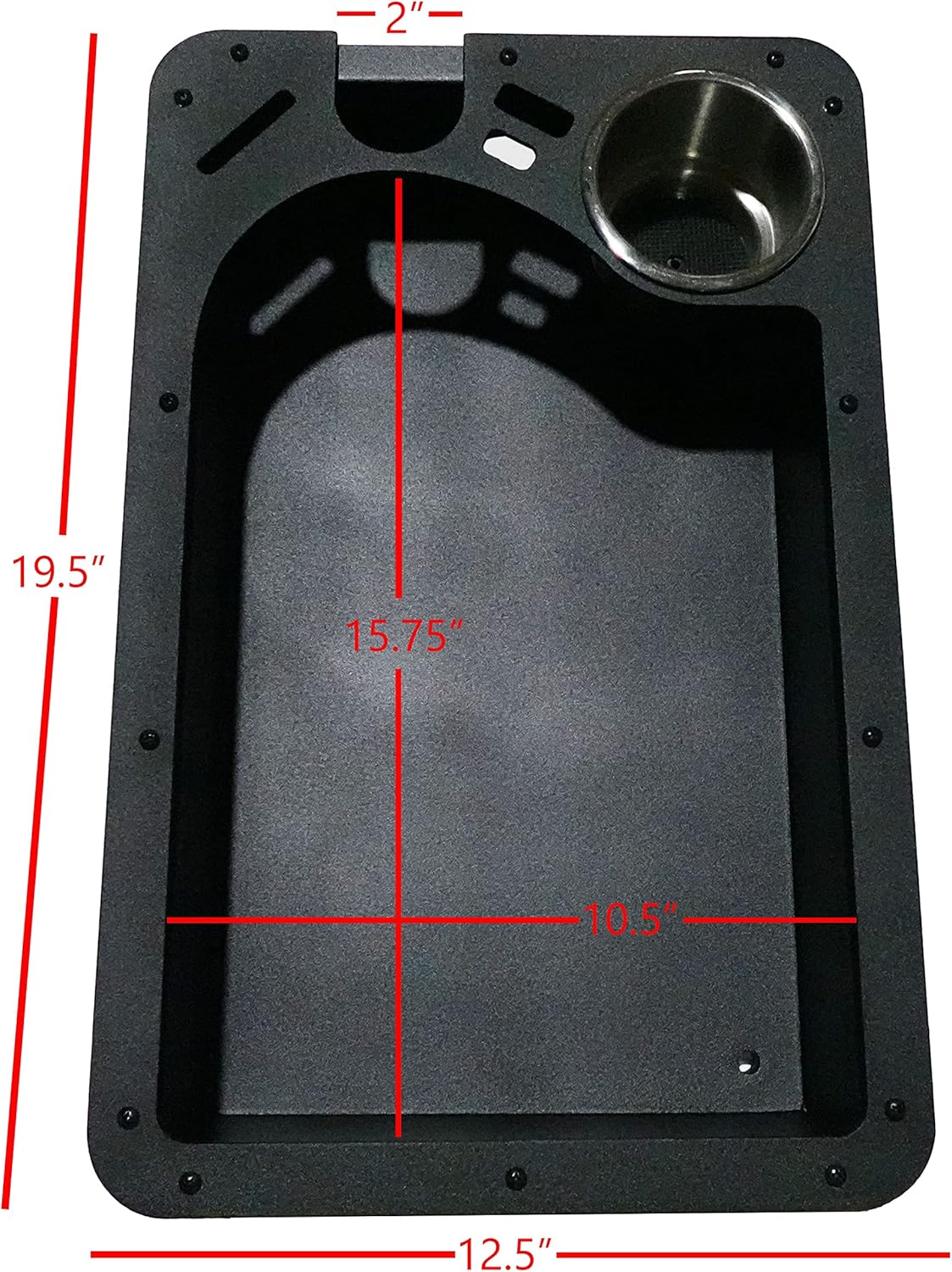 Made In American. All aluminum .120 inch construction. Thickest material on the market. Powder Coated with black UV Resistant Paint. Inside bottom of box is 17.5 inches X 10.5 inches, Top of lip is 19.25 inches X 12.5 inch. Package include: Template for cutting hole, Black stainless steel screws, Rubber hose for drain, and Zip Ties. Pan has a depth of 3.75 inches (+/-) metal thickness.