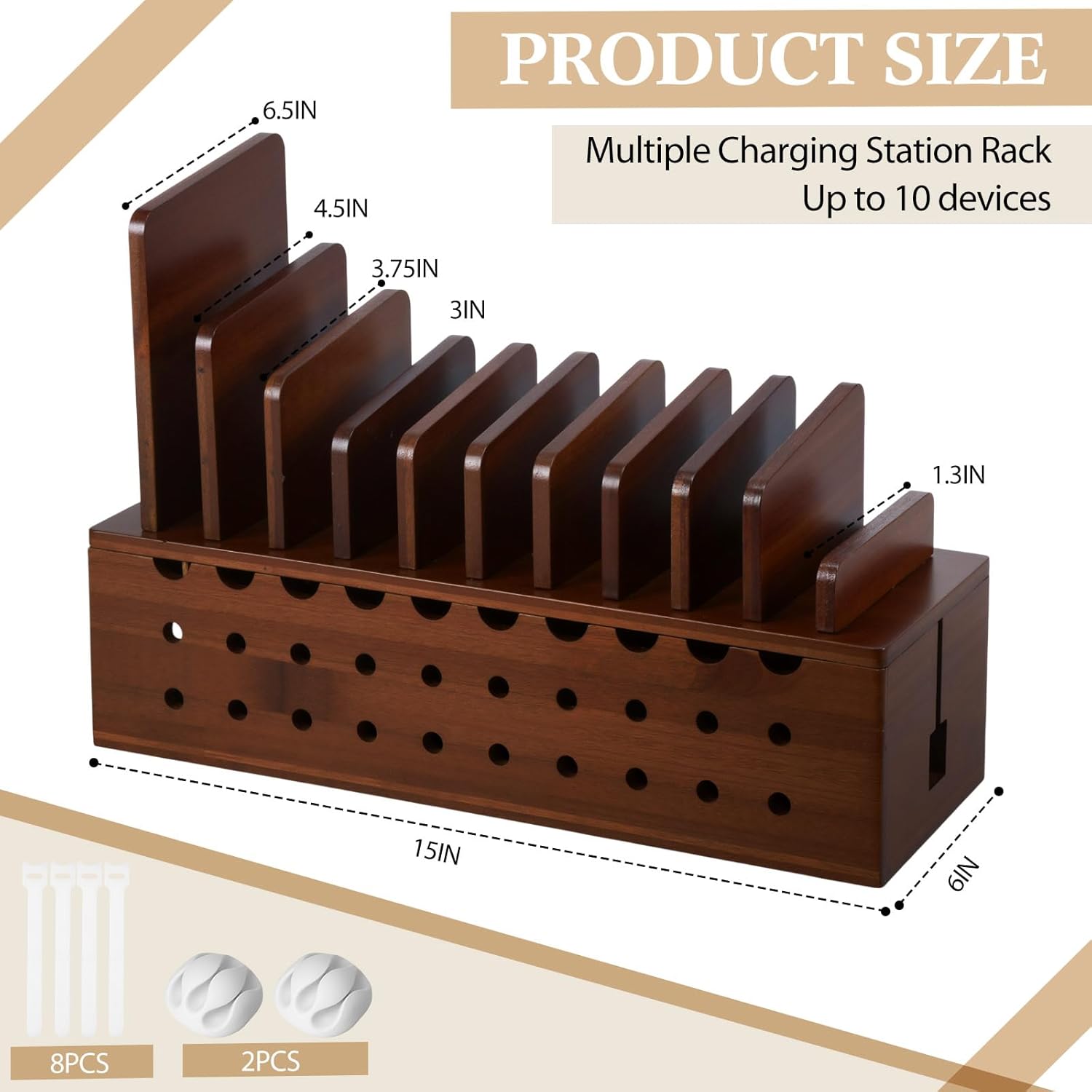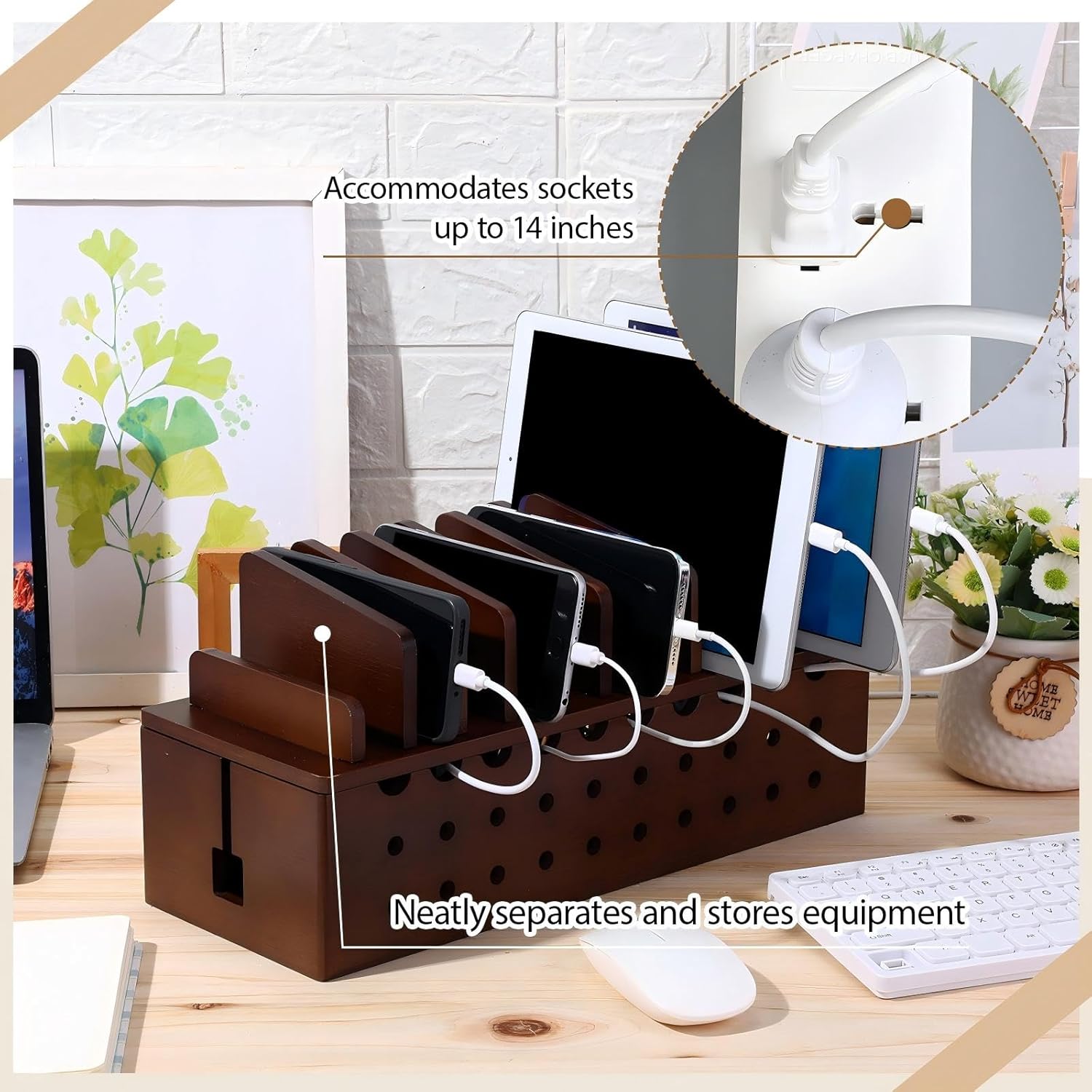 Bamboo Charging Station for Multiple Devices, Cell Phone Docking Charging Station Organizer and Cord Organizer for 10 Devices for Power Strip Storage, Phones and Tablets(Brown)