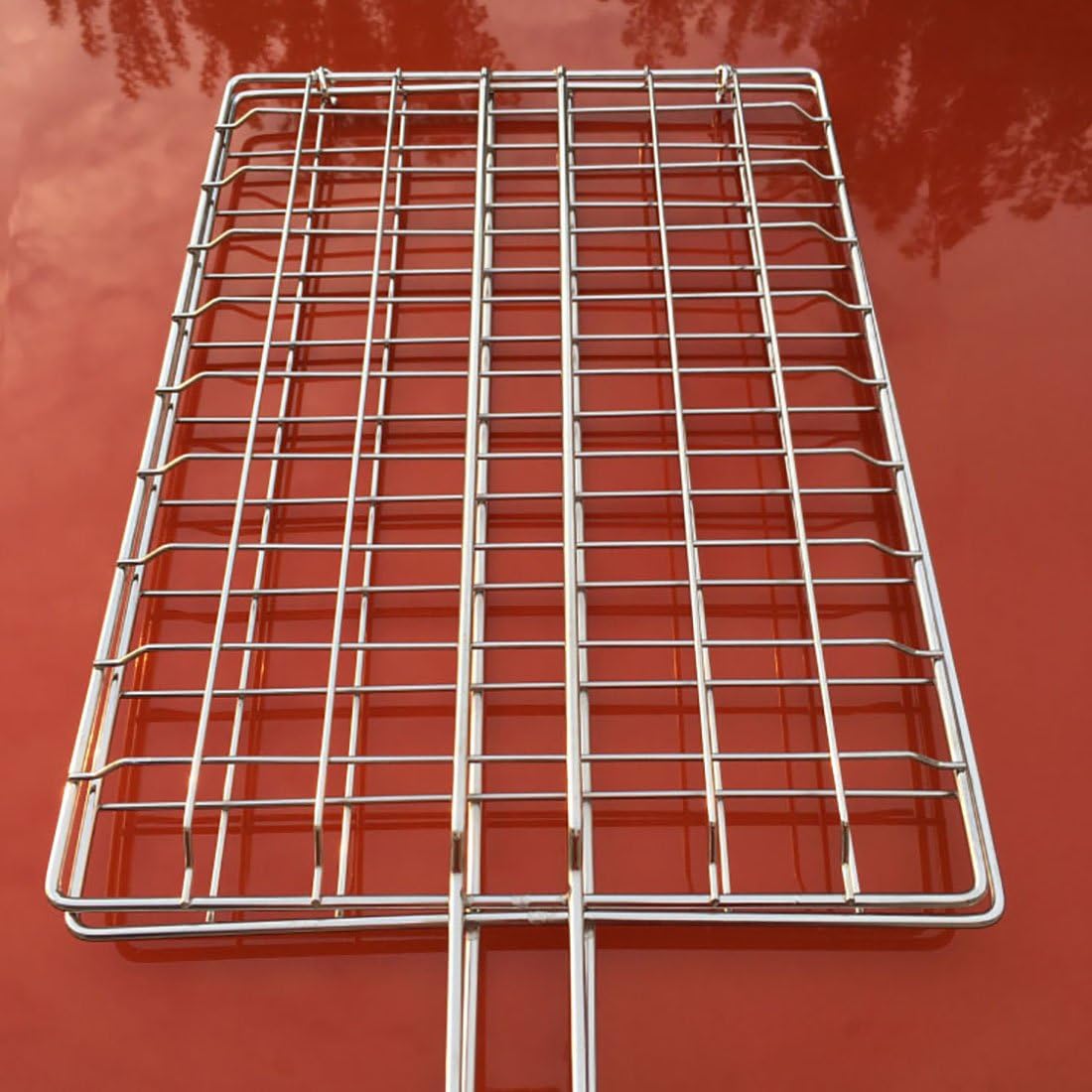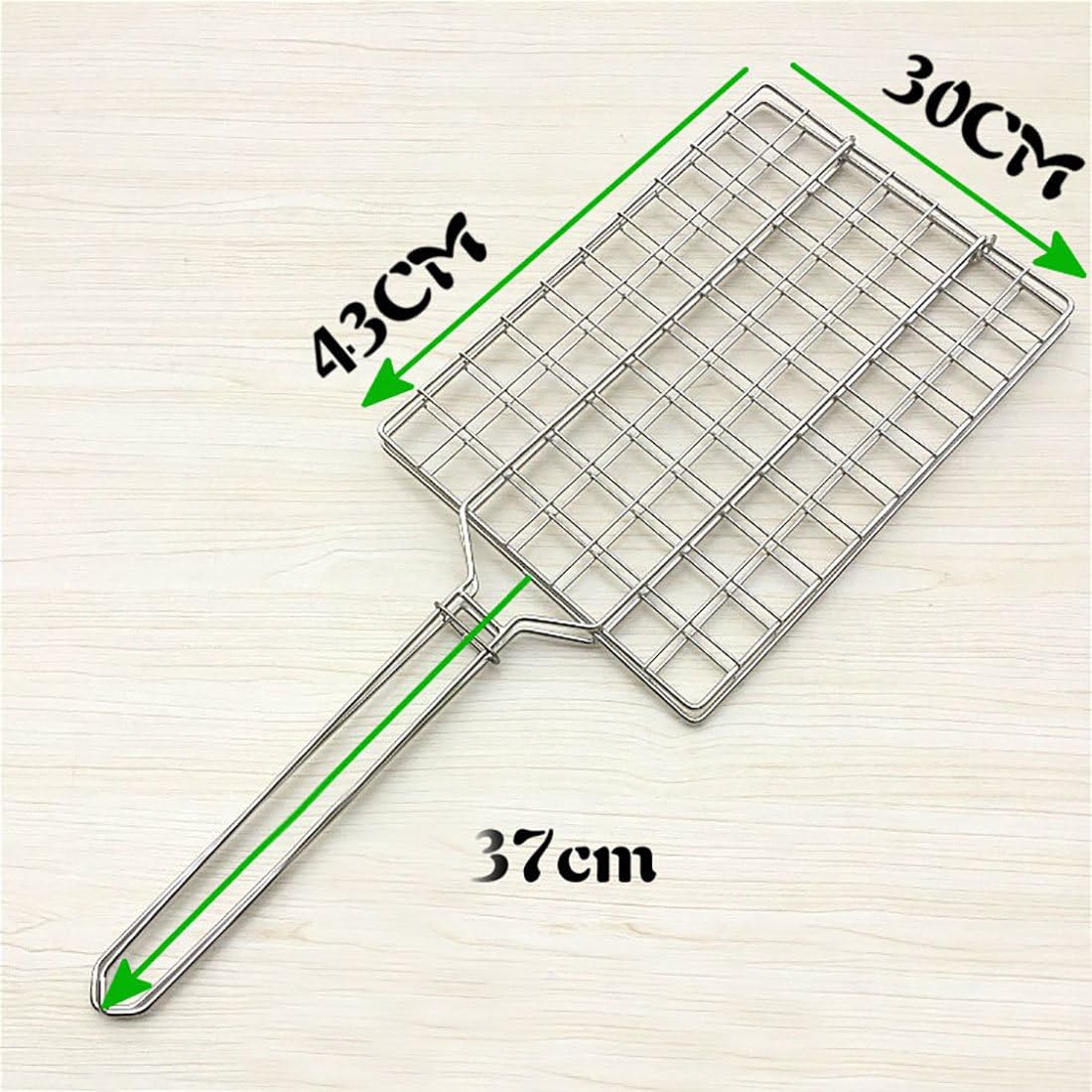 Two sizes to choose from, 43 * 30cm, 48 * 28cm, handle length: 37cm Stainless steel, not rusty, easy to clean. wire diameter: 3mm, frame diameter: 3.5mm, durable Large size, Ideal for grilling fish, vegetable, meat, pork chop, chicken, chicken wings, chicken neck, chicken, chicken head, chicken racks, etc No need to use barbecue skewers, you also could grill the best food and enjoy the taste of grilled foods