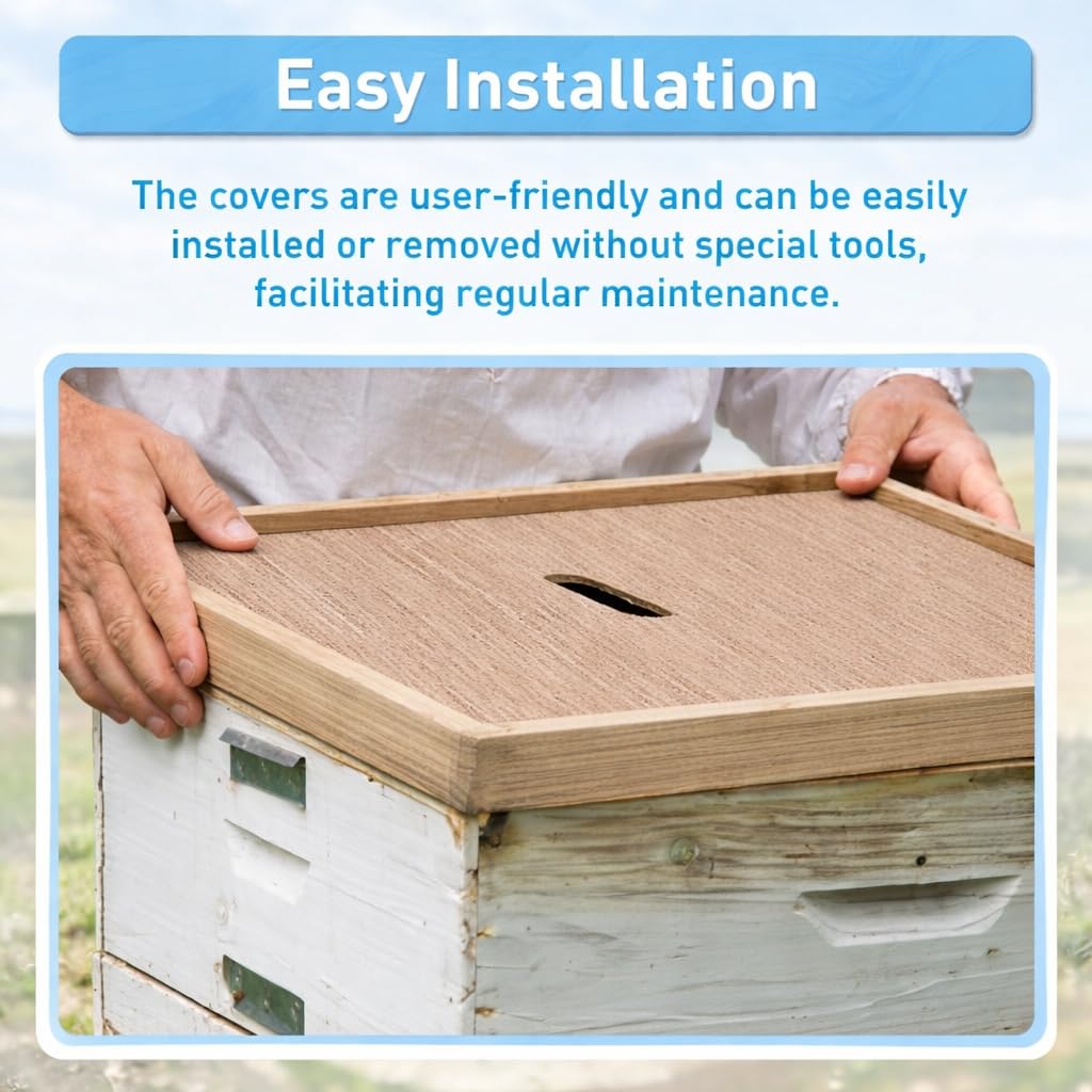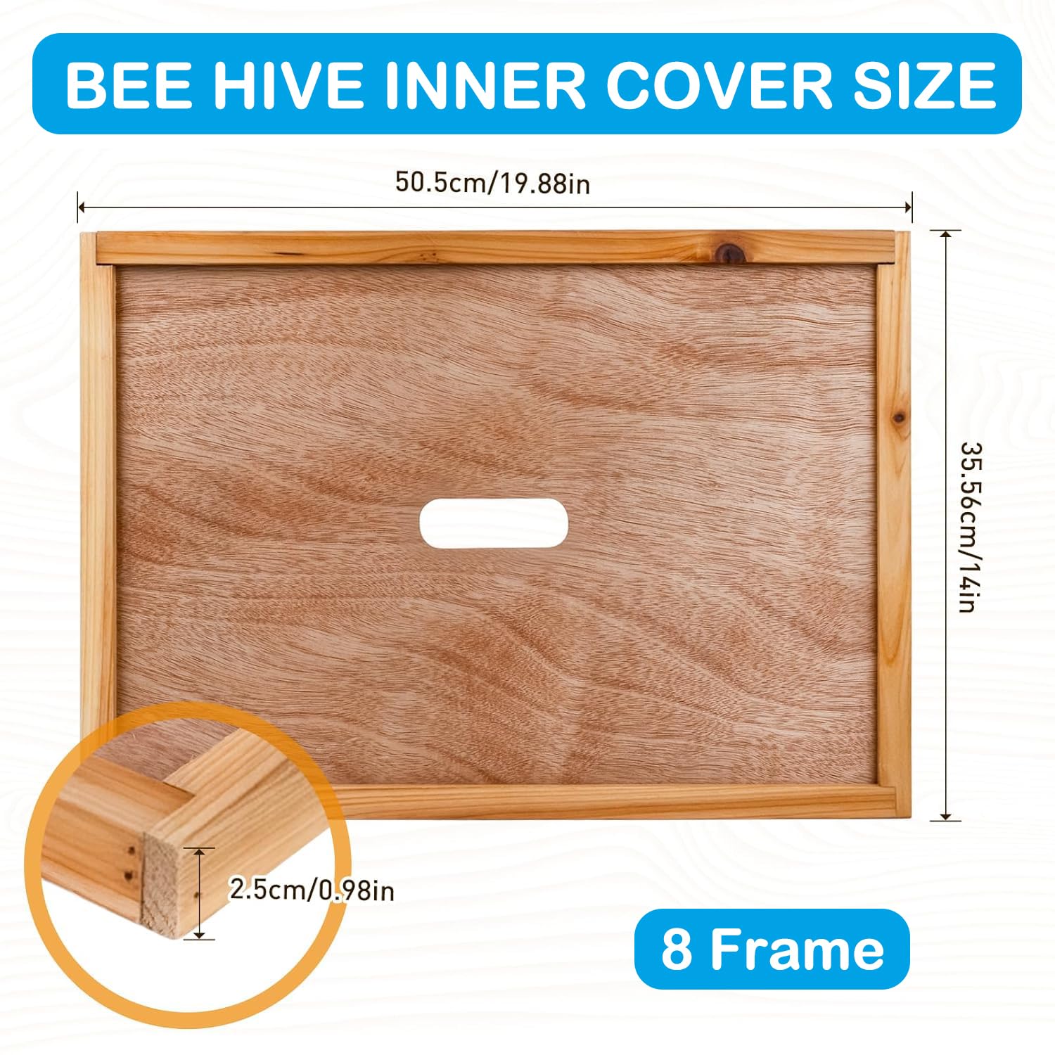 Name: Beehive Inner Cover for 8 Frame(with Feeding Hole)Application: Placed under the outer cover, the beehive inner cover provides insulation and ventilation.Specifications of Beehive Inner Cover For Beekeeping Tool:Width: 19.88"Length: 14"Height: 0.98"Material: Solid WoodPackage Includes:3 x 8 Frame Beehive Inner CoversWhat can the 8 frame beehive inner cover do?Separation and Insulation The beehive inner cover minimizes temperature changes in your hive. In summer, the inner cover can provide cool shade, stopping the bees from leaving due to overheating. In winter, the inner cover decreases heat loss, helping maintain optimal temperatures for reproduction and survival.Withstand Extreme WeatherUsed in conjunction with the outer cover, the inner cover further blocks rain from seeping in and strong winds from blowing, keeping the hive dry and avoiding diseases caused by humidity.Ventilation ControlThe inner cover is designed with feeding holes. In summer, the moisture and carbon dioxide produced can be expelled, and in winter, the entry of cold wind can be minimized.