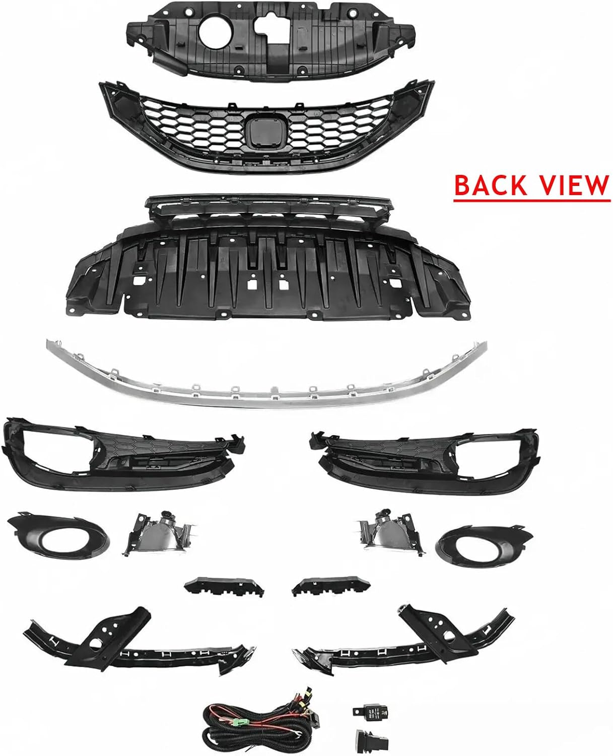 Bewild Front Bumper Upper & Lower Grille(W/Chrome Molding) + Radiator Support Cover + Fog Lights Assembly + Front Headlight Brackets + Bumper Support Brackets Fit For 2013 2014 2015 Honda CivicOur parts are made of high-quality plastic, which is not easily damaged or bent, durable, and has a long service life. Closely fitting with your original body, easy to installSpecifications:Brand:BewildMaterials:ABSColour:BlackOE/OEM Part Number:71125TR3A01, 71121TR3A01, 71122TR3A01, 71105TR3A51, 71108TR3A51, 33951TR0A51, 33901TR0A51, 71107TR3A51, 71106TR3A5, 71190-TR0-A00, 71140-TR0-A00, 71198-TR0-A01, 71193-TR0-A01Interchange Part Number:HO1224102, HO1202109, HO1200216, HO1036113, HO2592135, HO2593135, HO1038114, HO1039114Package Include:1 x Front Radiator Support Cover1 x Front Upper Grille(W/Chrome Molding)1 x Front Lower Grille1 x Front Bumper Lower Molding1 Pair of Fog Light Set With Bezel Covers1 Pair of Front Headlight Brackets1 Pair of Front Bumper BracketsFitment:Compatible with 2013 2014 2015 Honda Civic Sedan 4-Door(Sub-model: LX/HF/EX/EX-L)About Us:Bewild focuses on creating high-quality auto parts for you. Welcome to visit our store at any time, easily purchase products that accurately match your model.If the product has manufacturing defects or shipping damage, our after-sales service will provide you with a proper solution.We provide comprehensive pre-sales and after-sales support, and any questions will be answered within 24 hoursThank you for your purchase and support!