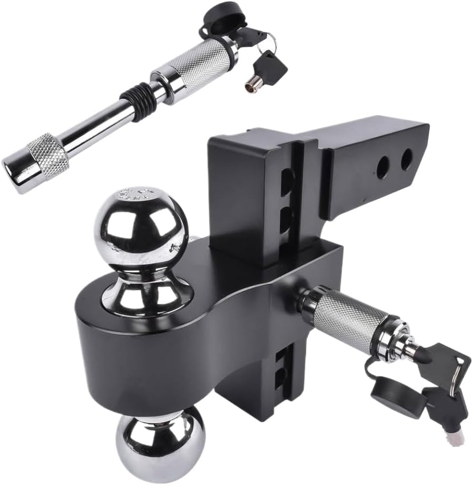 Trailer Hitch Black Fits 2-inch receiver Features: Powerful build: Trailer hitch constructed from aluminum, a lightweight material.The polished aluminum frame resists rust, cracking, and flaking.Integrated ball head eliminates need for separate ball mounts and prevents detachment during use.Reduces vibrations, chucking noise, and rattling when towing.Includes two locking hitch pins to secure the ball mount platform and provide anti-theft protection.Pin includes plastic cover to protect lock cylinder from rain, water, and sand.Specifications: 2-inch receiver 6-inch drop/rise 12, 500 lbs GTW Includes 2-inch ball and 2-5/16-inch ball Adjustment instructions: Slide the ball joint onto the stem.Insert the pin through any slot.Secure the pin in place.