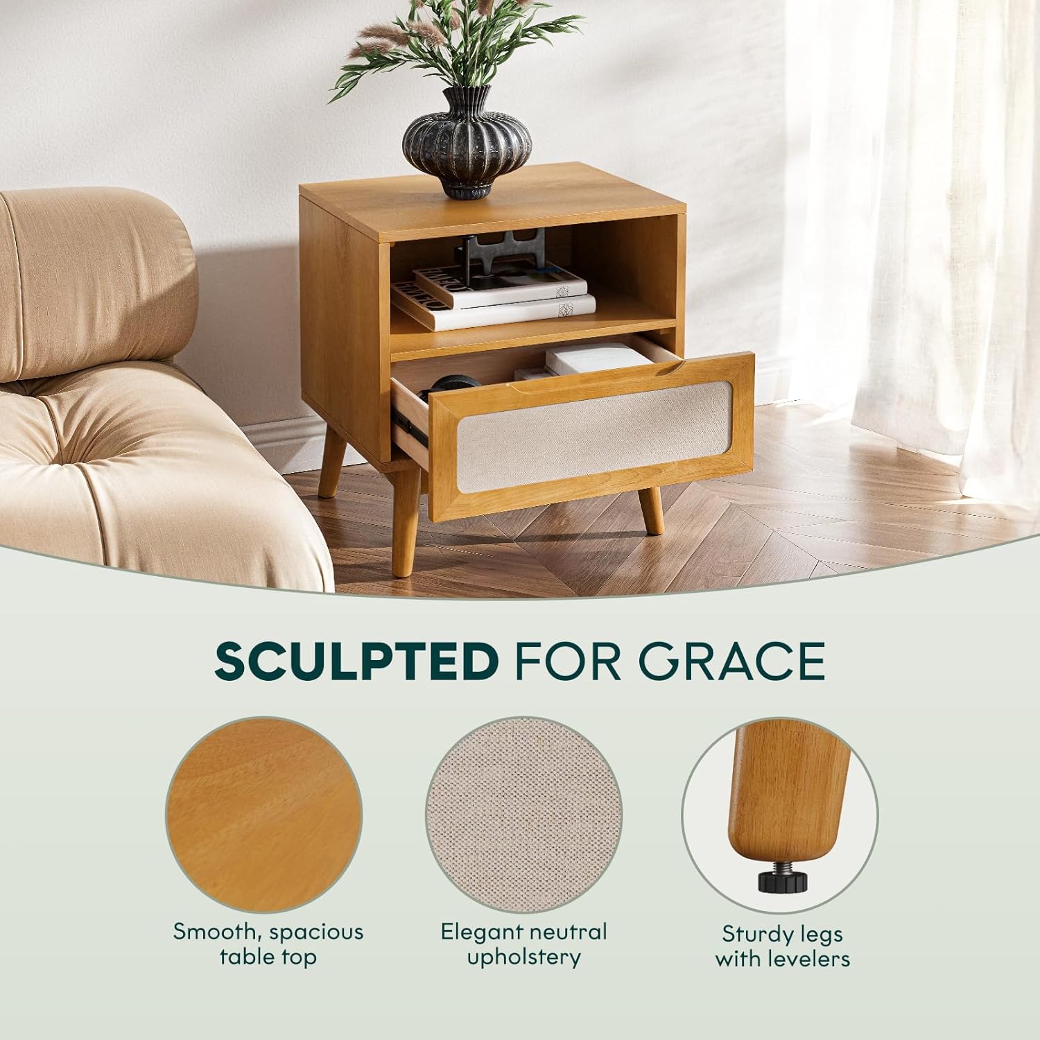"Bring mid-century sophistication to your bedside with the Calista Nightstand 1 Drawer in Teak Brown finish. Crafted from solid wood with anti-warp panels, this nightstand combines a fabric-fronted drawer for concealed storage and an open shelf for quick access to everyday items. The warm teak brown frame and neutral fabric accent create a timeless look, while the elevated base leaves space underneath for effortless cleaning. Designed to complement modern, Scandinavian, or transitional bedrooms, it pairs ideally with the Calista Bed Frame for a cohesive style.Key Features:One drawer with fabric panel front for concealed storageOpen shelf for quick-access itemsSolid wood frame with anti-warp panelsWarm Teak Brown finish with tapered legsPairs ideally with Calista Bed FrameCustomer Assurance:1-year warranty30-day returnsAssembly Info:Quick one-person assemblyIncludes tools, hardware, and instructionsUpgrade your bedroom with the Calista Nightstand, where mid-century style meets solid wood durability and everyday functionality."