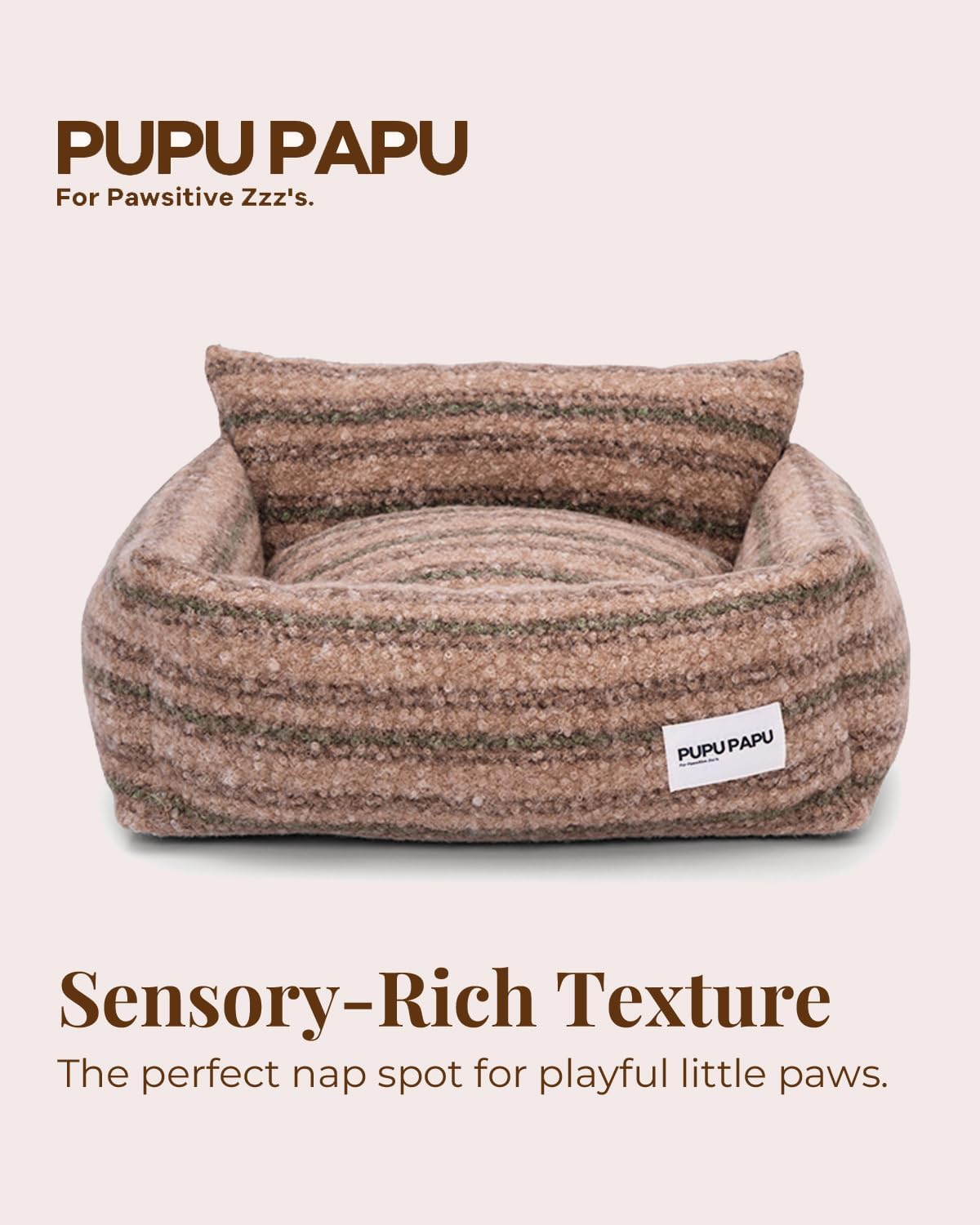 PUPUPAPU: Where Aesthetic Design Meets Ultimate Pet Comfort Give your furry friend a sanctuary that looks as good as it feels. The PUPUPAPU High-Back Striped Pet Sofa isn't just a bed; it’s a statement piece for your home. Designed by pet-loving aesthetics experts, this sofa bridges the gap between premium home furniture and cozy pet essentials. Why Choose the PUPUPAPU Pet Sofa? Designer-Inspired Aesthetics: Forget the hidden corners. Our earthy striped pattern and sophisticated bouclé texture are inspired by Mid-century modern furniture, designed to complement your living room, bedroom, or home office perfectly. The Comfort of a Warm Hug: Wrapped in a luxurious high-performance bouclé fabric, this bed offers a tactile experience similar to your favorite cozy sweater. The high-back bolster design provides a sense of architectural security, making it the perfect retreat for anxious cats or small pets who love to burrow. The Oatmeal Moss Edition: Designed for pet owners who value simplicity and organic beauty. The soft neutral oat base combined with natural moss-green stripes creates a peaceful retreat for your feline friend, echoing the serenity of a quiet forest floor. High-Resilience Support: Filled with premium, high-density PP cotton, our sofa offers superior orthopedic support for joints and muscles. Unlike thin mats, the PUPUPAPU sofa maintains its lofty shape and stability even after months of daily naps. Built to Last: We know pets can be tough on their belongings. Our 100% pet-friendly performance polyester fabric is specifically chosen for its durability—it's resistant to pilling, scratching, and snagging, ensuring it stays beautiful for years while outperforming traditional wool. Effortless Maintenance: Keeping your pet’s space fresh is easy. The sofa is fully machine-washable (gentle cycle, cold water) and quick-drying, retaining its softness and structural integrity wash after wash. Product Specifications: Dimensions: 21.6" x 17.7" x 11.8" (55 x 45 x 30 cm) Ideal for: Cats of all sizes and small dog breeds (e.g., Toy Poodle, Yorkshire Terrier, Chihuahua) under 15 lbs. Materials: Premium Performance Polyester Bouclé (Outer), High-Resilience PP Cotton (Filling) Packaging: Arrives vacuum-compressed. Please massage the filling upon opening and allow 24-48 hours for the bed to fully expand to its original luxurious shape.