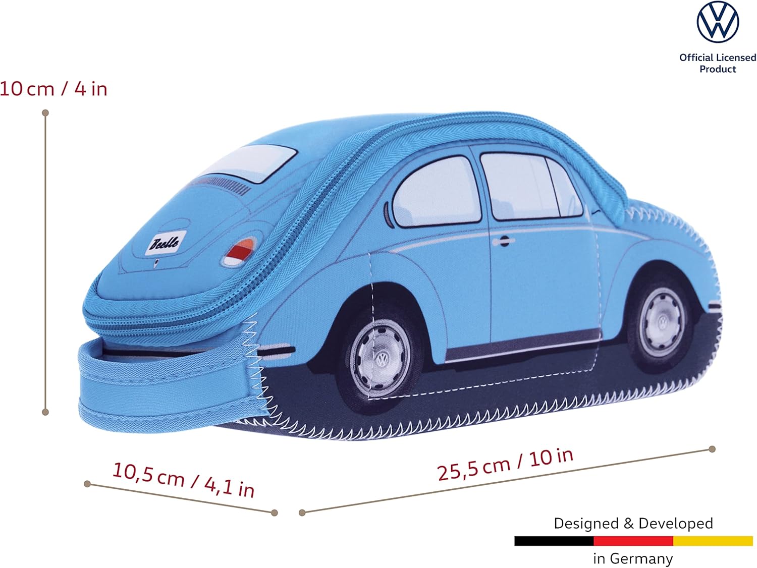 The unique universal bag made of soft neoprene in the shape of the legendary VW Beetle appeals to all globetrotters, car enthusiasts, free spirits, and travelers! This fantastic accessory brings the flair of the 60s into your life and caters to everyone's style. Perfect for Beetle drivers and fans on their travels! This lifestyle highlight is also available in a larger version in matching colors! Design | Uses | Features: The 3D VW Beetle universal bag comes in a flower-power style or a charming light blue with an allover print, making it a stylish accessory. It is versatile and can be used as a toiletry bag, cosmetic bag, for snacks, tools, shoe cleaning items, or as a travel pharmacy. The bag has a spacious interior compartment and is secured with a zipper that runs all around, featuring VW Beetle-style zipper pulls. Inside, there are three mesh compartments that provide sufficient storage and organization. The bag has a handle at the back for carrying or hanging. The VW Beetle toiletry bag is an exceptional and special gift that captures the essence of the cute icon. Material | Technical Data: The trendy Volkswagen universal bag is made of high-quality materials, soft, exceptionally robust, and resistant. The cool everyday helper is known for its high tear resistance. The flexible, stretchable, and insulating nature of neoprene makes it highly versatile. The all-rounder is made of sturdy neoprene (80% rubber, 20% polyester) and is water-resistant and weatherproof. It can also serve as a cool bag with cooling elements. If it gets dirty, it can be easily cleaned with handwashing. The stylish Beetle cosmetic bag offers a volume of approximately 1.74 liters (0.46 gallons), providing ample storage space. This makes the universal bag the perfect accessory for everyday use, vacations, or weekend trips. Dimensions: 25.5 x 10 x 10.5 cm (10 x 3.9 x 4.1 inches).