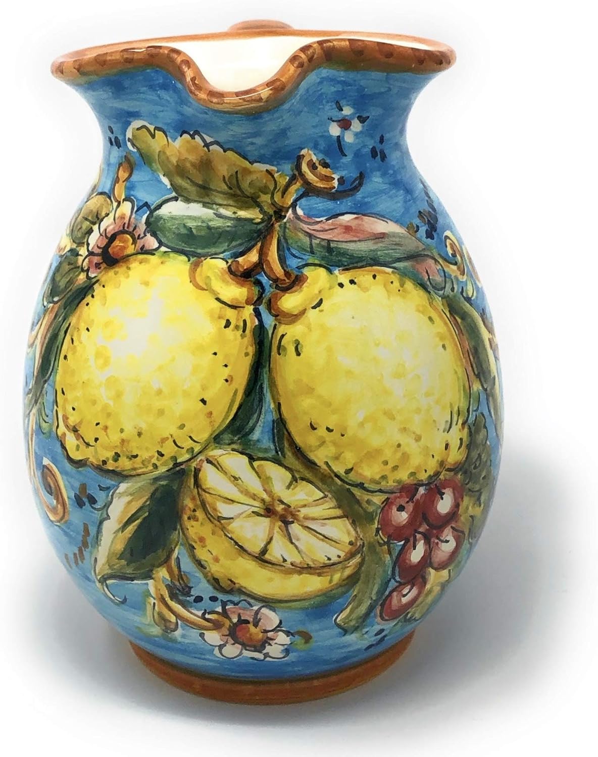 THE TOTAL PRICE INCLUDES CUSTOMS DUTY TAX PRODUCT INFORMATIONCeramic Pitcher Vine-water.Decoration:Collection Amalfi lemons ; this design is marked with the colors of the Amalfi coast, with the famous lemons that characterize it, a small lock of grapes, leaves and flower, on a turquoise background like the sea of the Amalfi coast, orange borderDimensions: 5.91 h Inch x 5,51 Inch-- Capacity approx : U.S gal 0,264PRODUCT INSTRUCTIONSAll our products are lead-free and can be used for foods . Dishwasher safe Do not use in microwave Do not use in oven