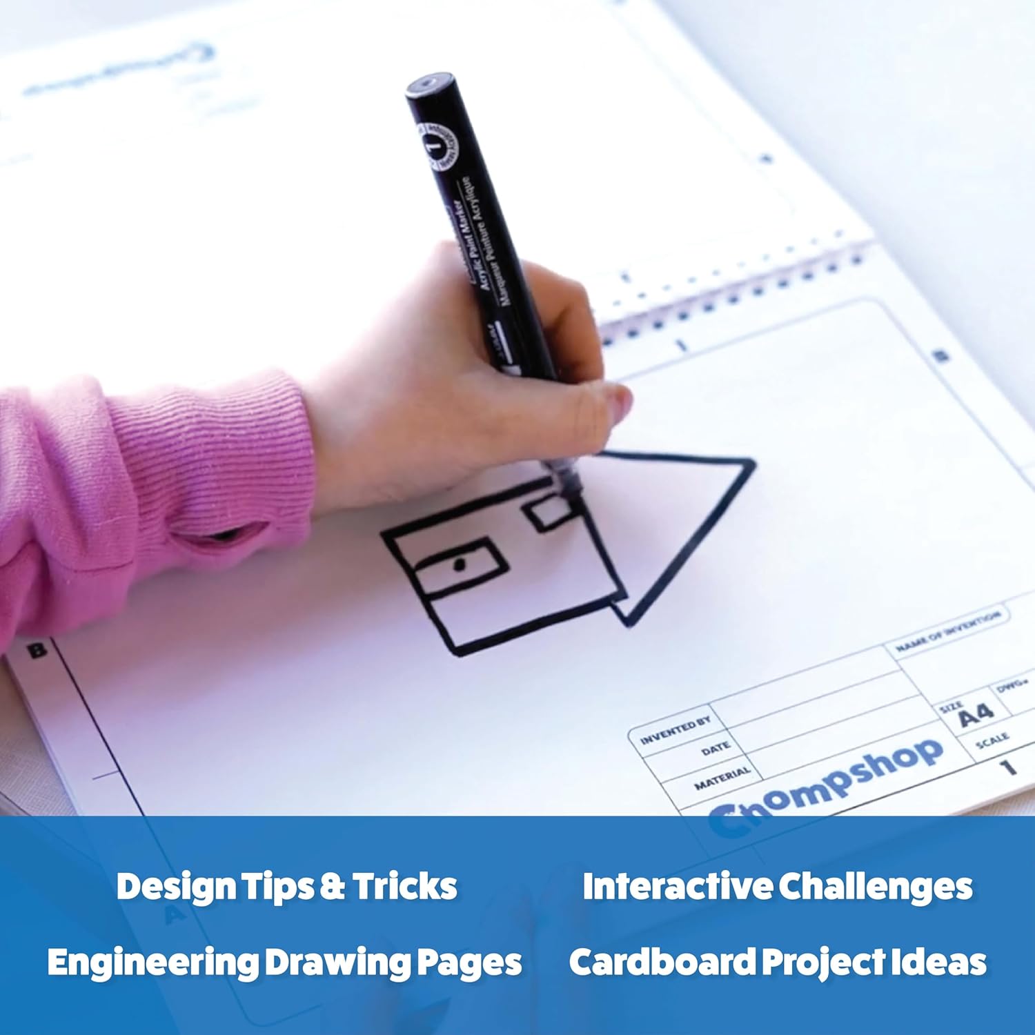 The ChompSaw is the kid-safe power tool that makes cutting cardboard safe, fun, and easy! Transform cardboard into endless creations like forts, costumes, dioramas, and more while learning engineering, design, and problem-solving skills through hands-on STEM and STEAM play. This bundle is paired with our Inventor’s Workbook, a hands-on engineering and design guide created for young makers, future engineers, and creative problem-solvers. Designed for ages 6+, this workbook teaches kids how to sketch like an engineer, build with cardboard using tabs and slots, and develop spatial reasoning through starter projects. With step-by-step prompts, design thinking challenges, and dedicated engineering drawing pages, children can bring their ideas to life while practicing STEM and STEAM skills. Whether used at home or in the classroom, the Inventor’s Workbook encourages critical thinking, creativity, and problem-solving through fun, interactive projects.