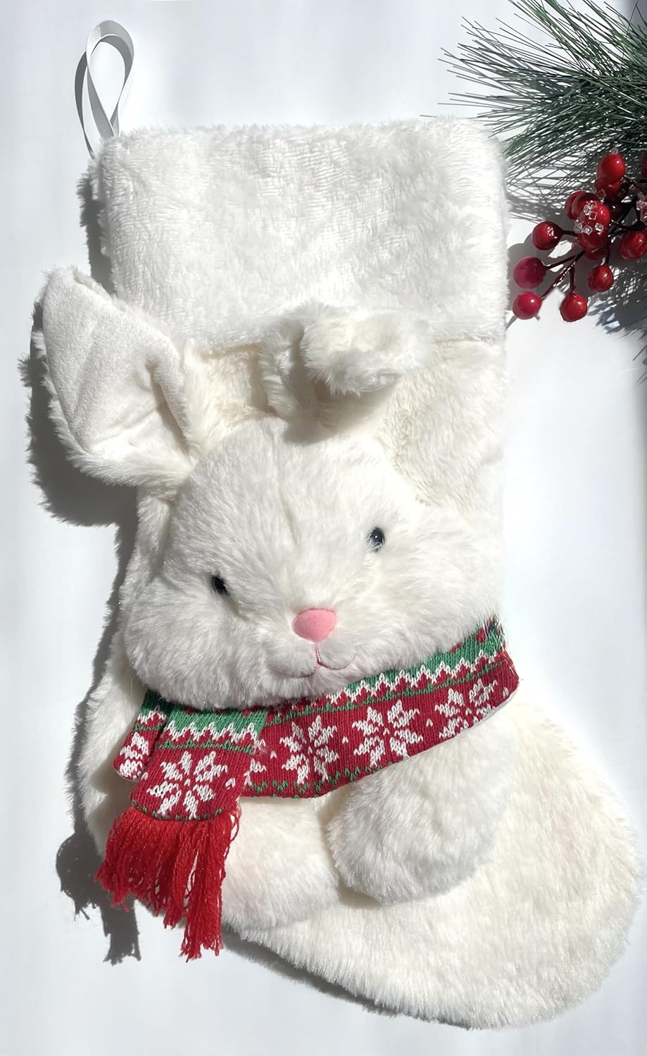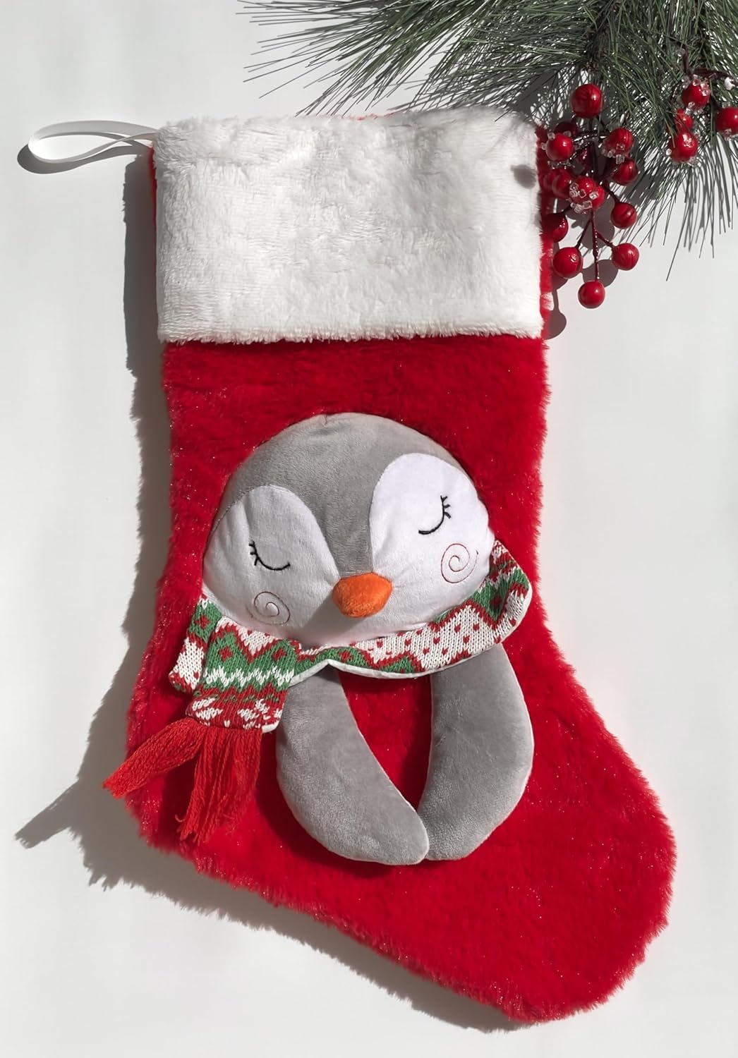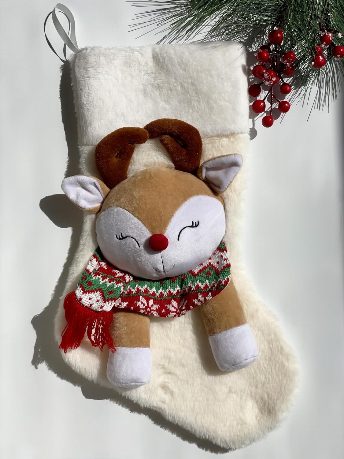 Christmas Stockings with 3D Plush Animal Characters that will bring Holiday Magic to Life! Celebrate Christmas with the most adorable stockings on the market! Featuring Polar Bear, Reindeer Girl and Reindeer Boy, Bunny, Silver Fox, Penguin, Cat and Dog, these 18-inch stocking combine a functional holiday essential with the charm of a cute character. Made with premium faux fur and topped with an intricately crafted 3D character, it’s a perfect keepsake for your little ones or those young at heart. Each stocking is designed to capture the festive spirit: the knitted scarves in white or classic Christmas colors add an extra touch of charm, while the embroidered details and multiple textures make each character come alive. Built to last, the durable materials ensure these stockings can be cherished year after year. Whether you’re filling it with goodies, complete your Holiday Decor of your mantle, or gifting it to a loved one, these stockings are guaranteed to make the holidays unforgettable. Main body: faux fur Easy maintenance: Washer / Dryer Each stocking has a sturdy ribbon, for easy hanging on Christmas stocking holders or fireplace.
