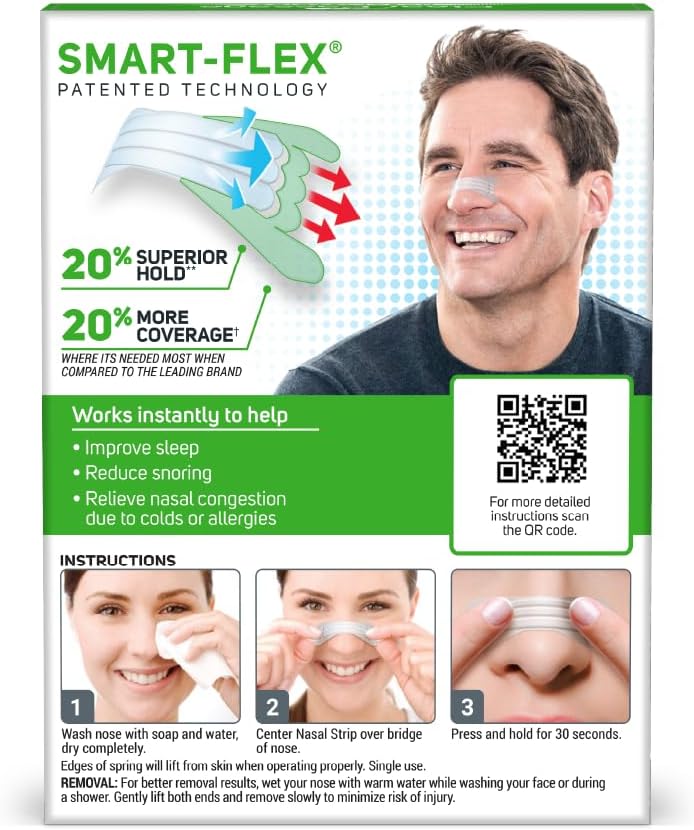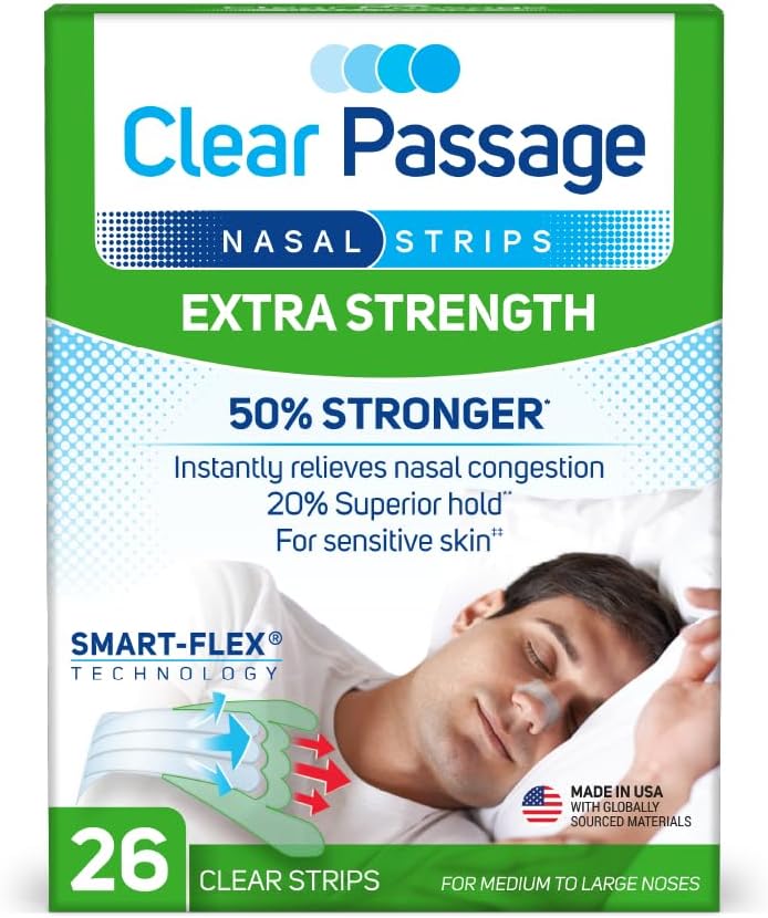 Clear Passage Nasal Strips Extra Strength provide powerful, instant relief from nasal congestion caused by colds, allergies, or other respiratory issues. The extra-strength design effectively lifts and opens nasal passages, making it easier to breathe and significantly reducing snoring for a better night's sleep. With 26 strips per pack, they offer a convenient, non-medicated solution for improved comfort and clearer breathing throughout the day and night.